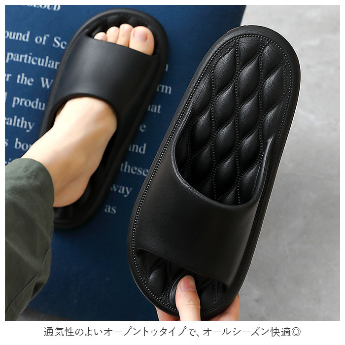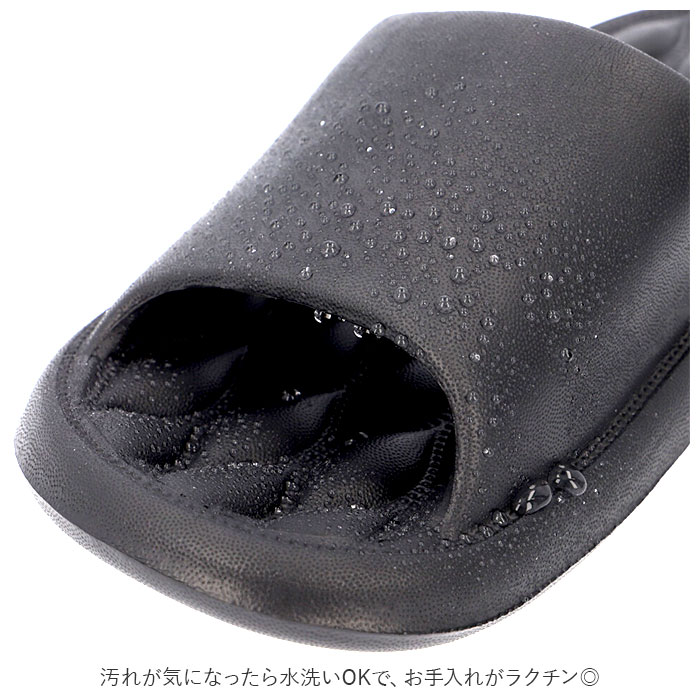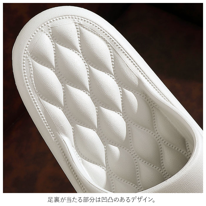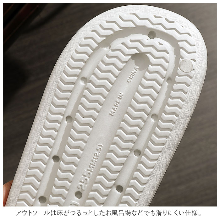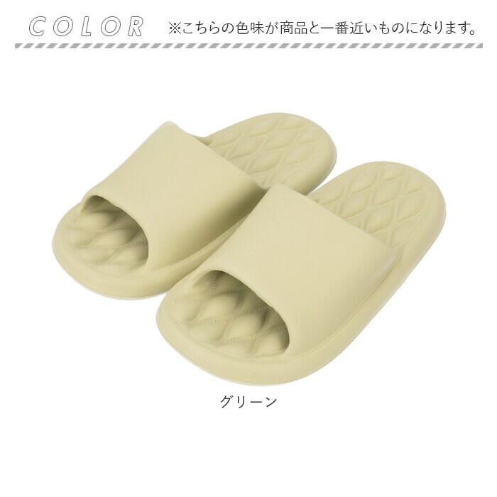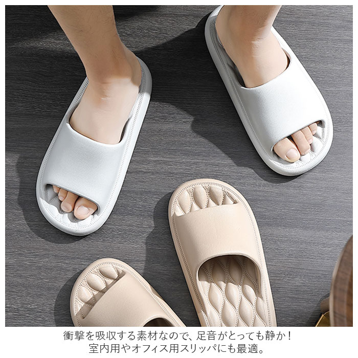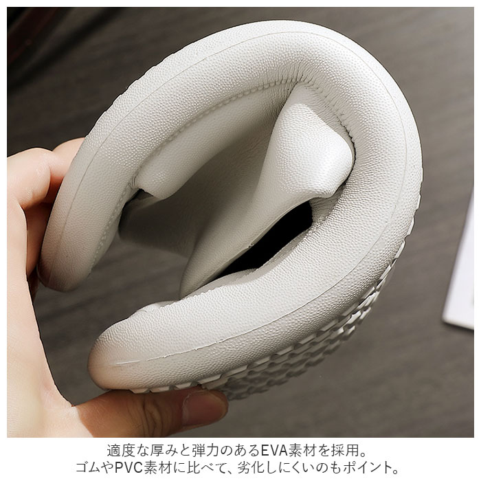 | 商品説明 | 柔らかくとっても軽量!使い勝手抜群の、洗えるスリッパが登場。通気性のよいオープントゥタイプで、オールシーズン快適◎適度な厚みと弾力のあるEVA素材を採用。ゴムやPVC素材に比べて、劣化しにくいのもポイント。衝撃を吸収する素材なので、足音がとっても静か!室内用やオフィス用スリッパにも最適。水はけが良く濡れてもすぐに乾くので、バス用スリッパやベランダサンダルとしても活躍!足裏が当たる部分は凹凸のあるデザイン。アウトソールは床がつるっとしたお風呂場などでも滑りにくい仕様。汚れが気になったら水洗いOKで、お手入れがラクチン◎ |