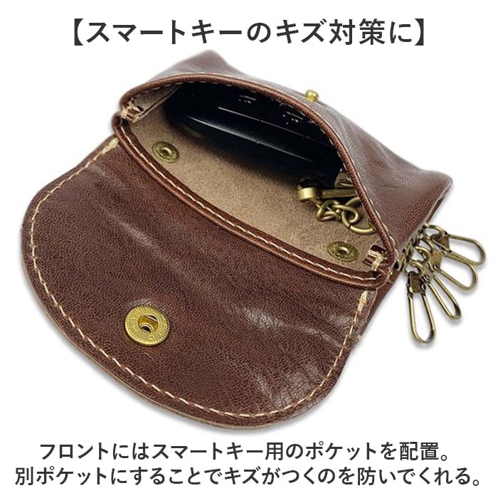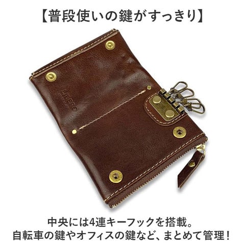 | 商品説明 | 【上質な大人のレザーキーケース】国内最高峰のレザーといわれている姫路レザーを使用した「LIBERO」のステッチデザインキーケース。【こだわりの日本製】兵庫県姫路市にある老舗のタンナーで染上げた高級レザーを国内で丁寧に加工した安心の日本製。【使うほどに深みが増す】しっとりと柔らかく、ハリとコシのあるレザーは耐久性にも優れ、使い込むほどに風合いが増す。【スマートキーのキズ対策に】フロントにはスマートキー用のポケットを配置。別ポケットにすることでキズがつくのを防いでくれる。【普段使いの鍵がすっきり】中央には4連キーフックを搭載。自転車の鍵やオフィスの鍵など、まとめて管理!【カードや小銭も収納OK】背面のファスナーポケットには免許証などカード類が入るサイズ。【ギフトにもおすすめ】年代問わず使えるシンプルなデザインと落ち着きのあるカラー。ゴールドの金具やステッチがアクセント。 |
