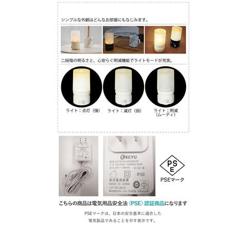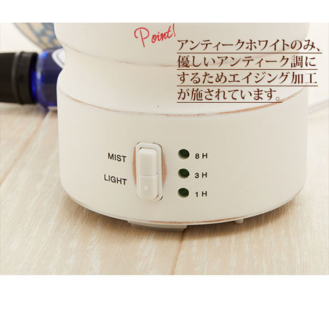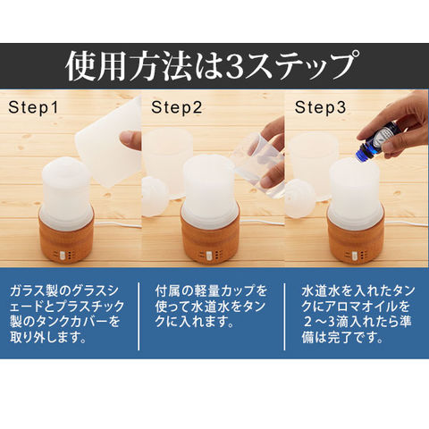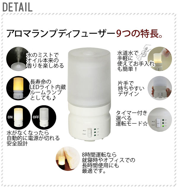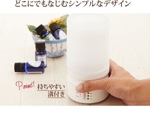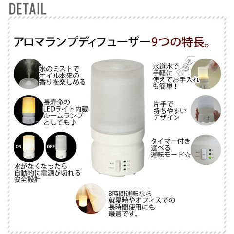 | 商品説明 | おしゃれなフロストガラスを通した柔らかいランプの灯りと、超音波で作られたきめの細かいミストが空間を包み、心を和ませてくれます。 とても静かなので、リビングはもちろん寝室でのご使用もおすすめ。 水のミストでオイル本来の香りを楽しめます。水道水で手軽に使えてお手入れも簡単です。水がなくなったら自動的に電源が切れる安全設計。タイマー付きで運転モードを選べます。8時間運転なら就寝時やオフィスでの長時間使用にも最適です。 また、シンプルで片手で持ちやすいデザインで、長寿命LEDライトを内蔵しているので、ルームランプとしても楽しめます。強、弱、明滅とライトモードを選択可能です。 |