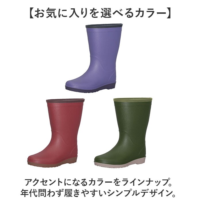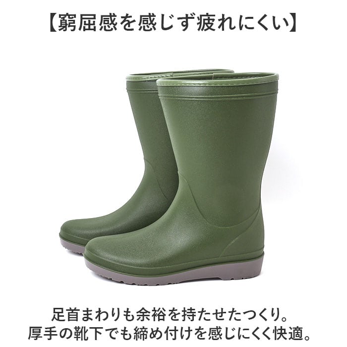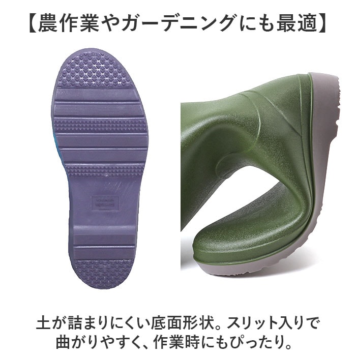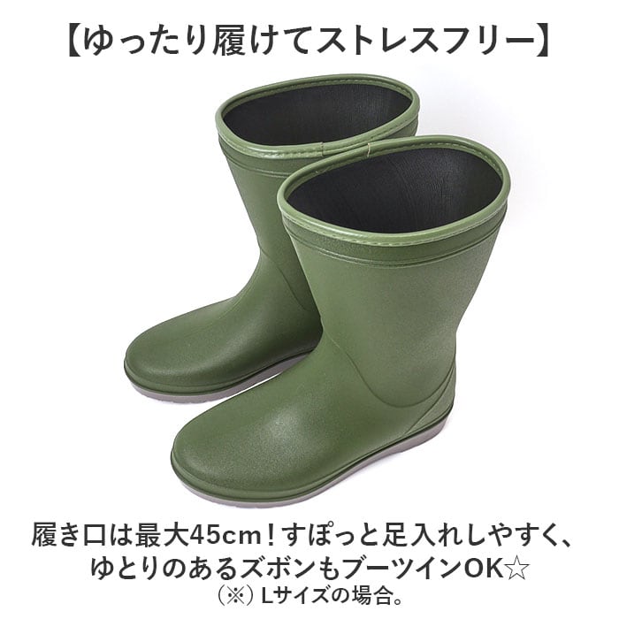 | 商品説明 | 【長靴を履くときのお悩みを解決】履き口が細い、ブーツインしづらい等の悩みに寄り添った「すぽっとゆるながぐつ」。【ゆったり履けてストレスフリー】履き口は最大45cm!すぽっと足入れしやすく、ゆとりのあるズボンもブーツインOK☆(※)Lサイズの場合。【窮屈感を感じず疲れにくい】足首まわりも余裕を持たせたつくり。厚手の靴下でも締め付けを感じにくく快適。【農作業やガーデニングにも最適】土が詰まりにくい底面形状。スリット入りで曲がりやすく、作業時にもぴったり。【軽やかで水にも強いながぐつ】ラバー製よりも軽量なPVC素材。つなぎ目のない一体成型&防水仕様で水場でも安心◎【取り外せるインソール付き】汗が気になったり、濡れてしまった時はサッと取り外し。お手入れしやすく衛生的。【お気に入りを選べるカラー】アクセントになるカラーをラインナップ。年代問わず履きやすいシンプルデザイン。 |