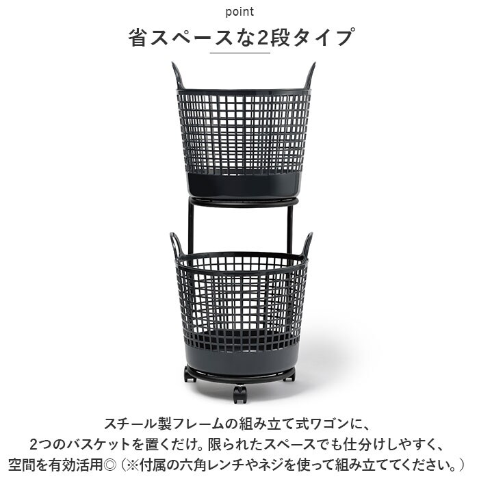 | 商品説明 | すっきり整理整頓&シーンに応じて使い分けできる「like-it ランドリーバスケット 2段タイプ」が新登場。【省スペースな2段タイプ】スチール製フレームの組み立て式ワゴンに、2つのバスケットを置くだけ。限られたスペースでも仕分けしやすく、空間を有効活用◎(※付属の六角レンチやネジを使って組み立ててください。)【移動がスムーズ】ワゴンは軽く押すだけでスイスイ移動できる、キャスター付き。洗濯物が多い時も安心!【フラットな背面】ワゴンの背面はフラットなつくりで、壁に沿って置くことが可能。すっきり収まるのが嬉しい♪【ざっくり入れられる丸型バスケット】バスケットは洗濯物をポイポイ入れられる、丸型オープンタイプ。【使い勝手ばっちり】軽量で柔軟性のある素材を使い、両サイドには取っ手付き。通気性が良く、脱衣カゴに最適。【環境にも配慮】バスケット本体に、サトウキビ由来のバイオマスプラスチックを約30%使用。環境にやさしいアイテム。【選べるカラー】空間に馴染みやすいカラーで、フレーム部分はマットな粉体塗装仕上げ。装飾のないシンプルなデザインが魅力。 |