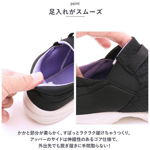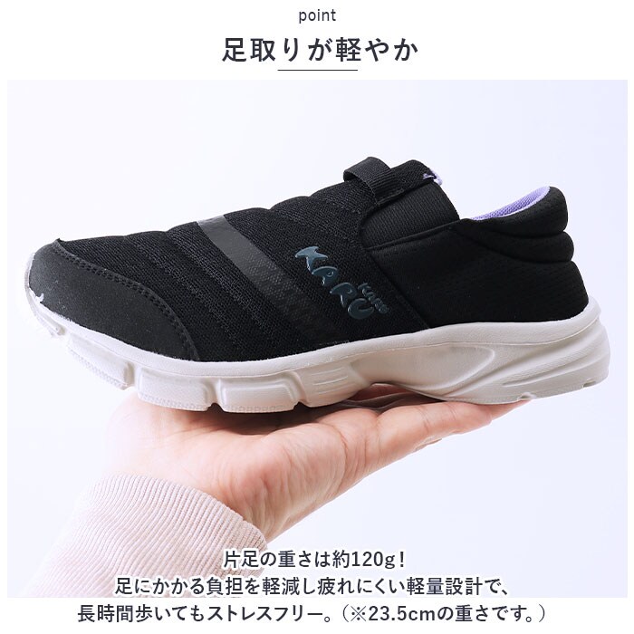 | 商品説明 | すぽっと履けて履き心地も抜群!「婦人かるかるリラックス」 スリッポンタイプが新登場。【足入れがスムーズ】かかと部分が柔らかく、すぽっとラクラク履けちゃうつくり。アッパーのサイドは伸縮性のあるゴア仕様で、外出先でも脱ぎ履きに手間取らない!【便利なスリッポンタイプ】そのままではもちろん、かかとを踏んでサンダルのように履いてもOK。お好みやシーンに合わせてチョイス☆【足取りが軽やか】片足の重さは約120g!足にかかる負担を軽減し疲れにくい軽量設計で、長時間歩いてもストレスフリー。(※23.5cmの重さです。)【歩きやすさが向上】屈曲性があり、つま先が上を向いた形状。つまづきにくく、蹴り上げやすい!【安定感のあるソール】グリップ力とクッション性に優れた、独自配合のソール。歩行時の衝撃を和らげ、凹凸仕様で滑りにくく安全。【サラッと快適】通気性が良くムレにくいメッシュ生地で、オールシーズン重宝するアイテム。デイリー使いのシューズとしてはもちろん、お仕事やウォーキング用にもおすすめ。 |