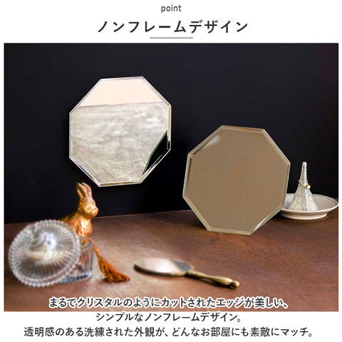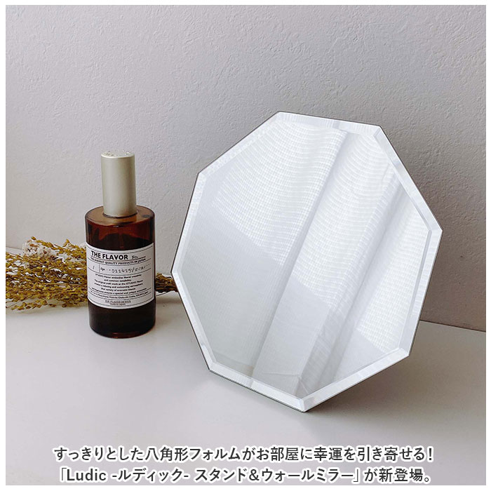 | 商品説明 | すっきりとした八角形フォルムがお部屋に幸運を引き寄せる!「Ludic -ルディック- スタンド&ウォールミラー」が新登場。【ハンドメイド仕上げ】4mm厚のミラーを、手作業でひとつひとつ、幅広に面取りして仕上げたハンドメイドミラー。【ノンフレームデザイン】まるでクリスタルのようにカットされたエッジが美しい、シンプルなノンフレームデザイン。透明感のある洗練された外観が、どんなお部屋にも素敵にマッチ。【美しい八角形フォルム】風水の世界では、四方八方からエネルギーを引き寄せ、悪い気を跳ね返す力があるとされている「八角鏡」。バランスのよいシンメトリーフォルムが、見た目にもエレガント。【壁掛け&スタンドの2WAY仕様】寝室やリビングの壁にさりげなく飾れるのはもちろん、背面のスタンドで卓上ミラーにもできる「壁掛け&スタンド式」の2WAY仕様。【無段階角度調節スタンド】卓上で使うときには、ミラー背面の無段階角度調節スタンドで、お好みの角度でメイクができるのが嬉しいポイント。【小ぶりで見やすいサイズ】大き過ぎず、持ち運びにも困らない18cm×18cmのコンパクトサイズ。小ぶりながらもお顔がしっかりと映るから、使い勝手抜群。【飾るだけで手軽に開運】気の入口とされる玄関に姿見代わりに飾れば、手軽に運気がUP!玄関に入って左側に飾ると金運UP、右側に飾ると地位や名誉運のUPに効果的!【自分色にアレンジ自在】お気に入りのアクセサリやコスメを置けば、お洒落なアクセサリートレイに。観葉植物や多肉植物の小鉢を置けば、インテリアがパッと華やぐ。【ギフトにおすすめ】小ぶりなサイズ感と、一切の装飾を省いた優しい外観がお部屋の素敵なアクセントに。お引越し祝いなどの贈り物にも最適。 |