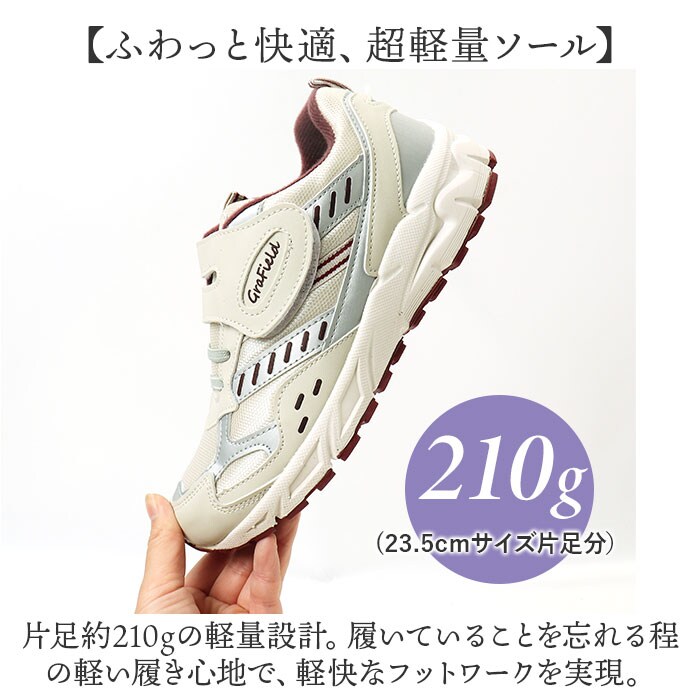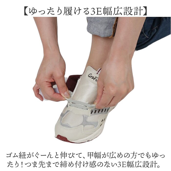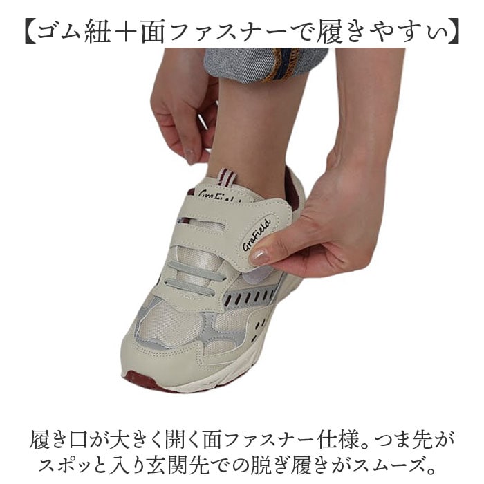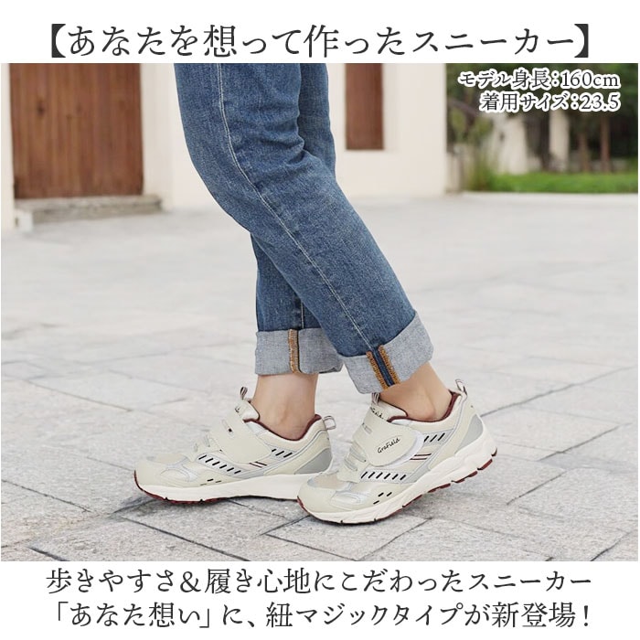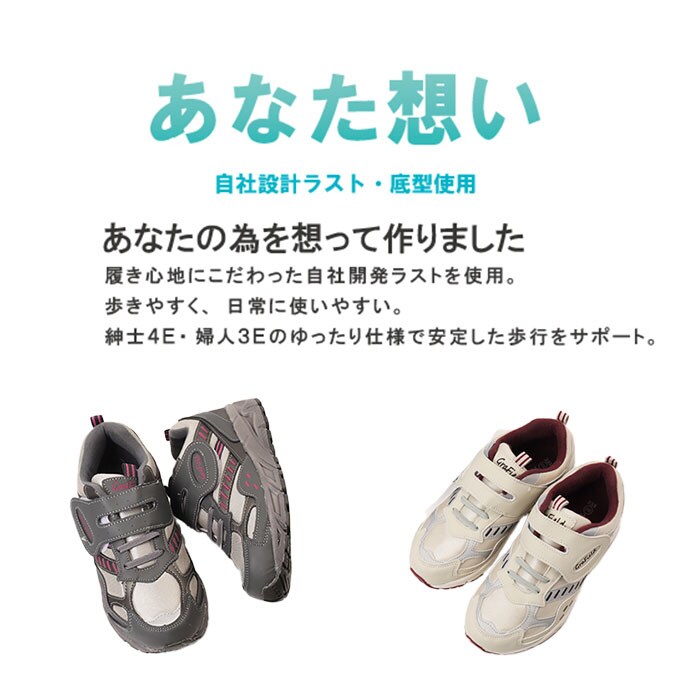 | 商品説明 | 【あなたを想って作ったスニーカー】歩きやすさ&履き心地にこだわったスニーカー「あなた想い」に、紐マジックタイプが新登場!【ゴム紐+面ファスナーで履きやすい】履き口が大きく開く面ファスナー仕様。つま先がスポッと入り玄関先での脱ぎ履きがスムーズ。【ふわっと快適、超軽量ソール】片足約210gの軽量設計。履いていることを忘れる程の軽い履き心地で、軽快なフットワークを実現。※23.5cmサイズの商品、片足分の重量です。【どんどん歩けるEVAソール】低反発EVAソールが歩行時の衝撃をふんわり和らげ、足や膝にかかる負担を効果的に軽減。【ゆったり履ける3E幅広設計】ゴム紐がぐーんと伸びて、甲幅が広めの方でもゆったり!つま先まで締め付け感のない3E幅広設計。【柔らかな履き口がフィット】履き口周りは厚みのあるクッション生地で仕上げ、足首やかかとを靴ズレから優しく保護。【安定着地・Gソール採用】全面ゴムの防滑アウトソールが濡れた路面をしっかりグリップ。安定感のある着地をサポート。【キラリと光るリフレクター】つま先とかかとに、自動車のライトを反射するリフレクター素材を配置し、夜間のお出掛けも安心。【普段履きをお洒落にワンランクUP】光沢感のあるメッシュに滑らかな合皮を合わせたお洒落なデザインで、誰でもすぐに垢抜けスタイル。【様々なシーンにオススメ】タウンユースに気軽に履けるのはもちろん、ウォーキングやフィットネス、リハビリシューズにも。 |