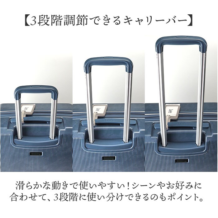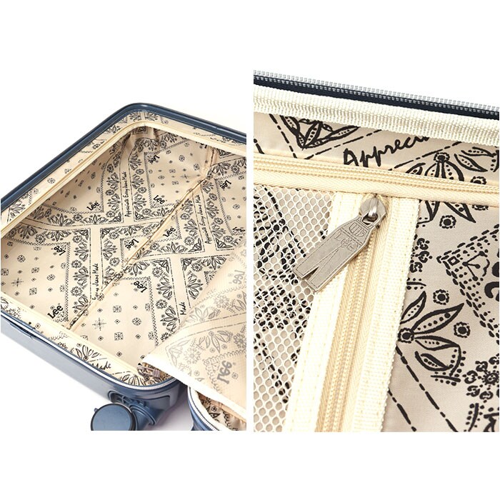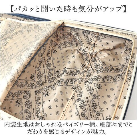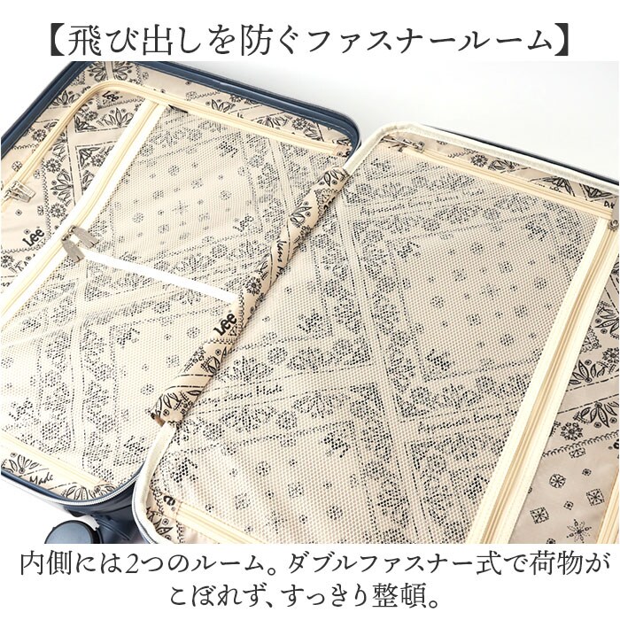 | 商品説明 | 【楽しく快適な旅をサポートする相棒】おしゃれに持ち歩ける☆「Lee Galaxy キャリーバッグ」22インチ拡張タイプ。【スタイリッシュにキマるキャリー】シンプルな本体に、Leeの立体ロゴをON!飽きが来ず、何代問わず持ちやすい仕上がり。【たっぷり入る22インチサイズ】・5泊程度の旅におすすめの大きさ。海外旅行時や荷物の多い方も安心サイズ。【荷物量に合わせて調節できる拡張機能】背面側のファスナーを開くとマチが広がり、52L→60Lに!荷物が増えても安心♪【防犯面も安心のTSAロックを搭載】鍵をかけたまま荷物を預けることが可能。鍵を持ち歩く手間のないダイヤル式。(※)アメリカへの渡航時は、鍵をかけないもしくはTSAロック対応の鍵を付けることが義務付けられています。【埋め込み式ファスナーロック】収納ルーム開口部はダブルファスナー。埋め込んでロックでき、スライドで簡単オープン。【飛び出しを防ぐファスナールーム】内側には2つのルーム。ダブルファスナー式で荷物がこぼれず、すっきり整頓。【サッと取り出せるメッシュポケット】視認性が高く、小物をすぐ手に取れる!細々したものも、迷子知らず◎【パカッと開いた時も気分がアップ】内装生地はおしゃれなペイズリー柄。細部にまでこだわりを感じるデザインが魅力。【ストレスのないスムーズな走行】旋回性に優れた双輪キャスター。荷重が分散されることで安定感のあり、動きがスマート。【固定できるキャスターストッパー】フロント側のキャスターには、ワンタッチ式ストッパー機能を。乗り物等での不意な走行を防止。【衝撃から守るコーナーパッド】衝撃を受けやすい上部のコーナーにはパッドを。傷つきや擦れをガード。【3段階調節できるキャリーバー】滑らかな動きで使いやすい!シーンやお好みに合わせて、3段階に使い分けできるのもポイント。 |