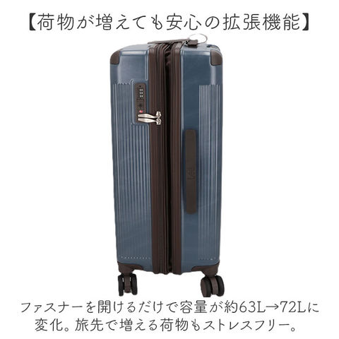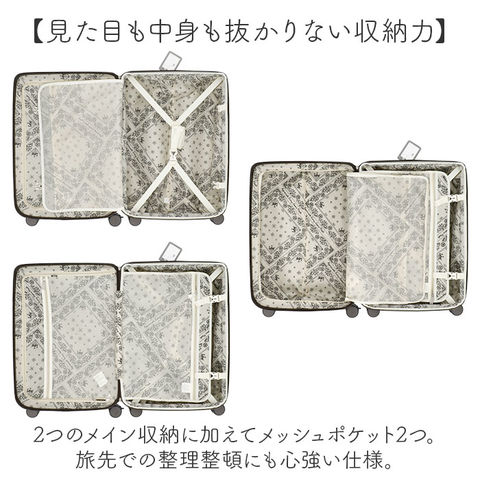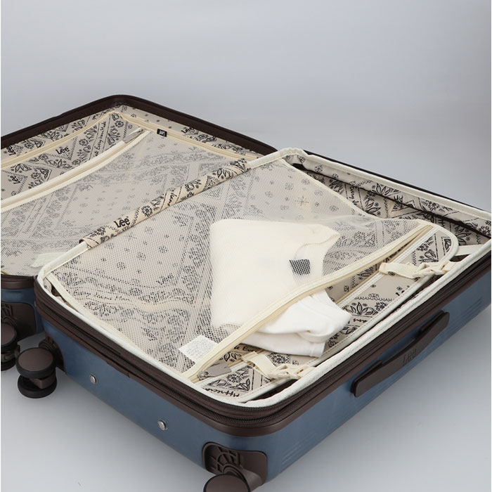| 商品説明 | 【旅の相棒にぴったりな頼れる存在】旅行も出張もおまかせ。大人気ブランドLeeから、機能性抜群のキャリーケースが登場。【荷物が増えても安心の拡張機能】ファスナーを開けるだけで容量が約63L→72Lに変化。旅先で増える荷物もストレスフリー。【ストッパー付き4輪キャスター】電車の中でも安心な前輪ストッパー付き。静かでスムーズな移動を叶える安定感ある足元。【見た目も中身も抜かりない収納力】・2つのメイン収納に加えてメッシュポケット2つ。旅先での整理整頓にも心強い仕様。【TSAロック&調節ハンドル付き】海外旅行にも安心なTSAロックと、身長やシーンに合わせて調節できる3段階ハンドル。(※)TSAロックとは・・・アメリカ運輸保安庁(TSA)が認可したロックシステム。アメリカ以外の国際空港では荷物検査で開錠の際、鍵を壊す場合がございます。【自分だけの目印になるネーム付き】ひと目でわかるネームタグ付き。家族旅行やお子さまの使用にも安心な工夫!【Leeならではの大人カジュアル】ブランドロゴや引手、バンダナ柄の内装など、細部のディテールにまで宿る遊び心とこだわりが◎ |