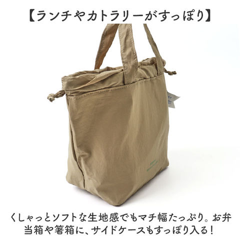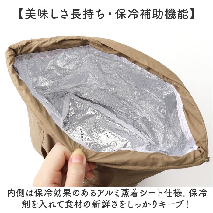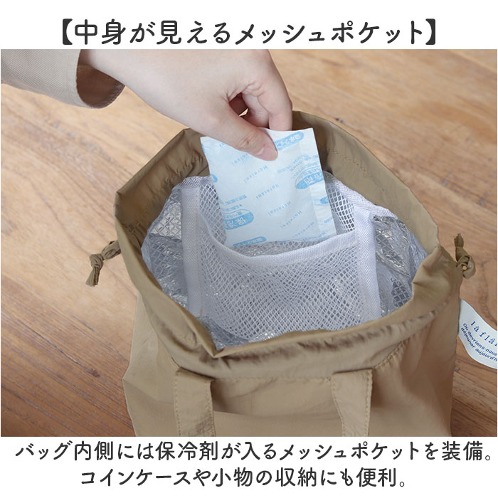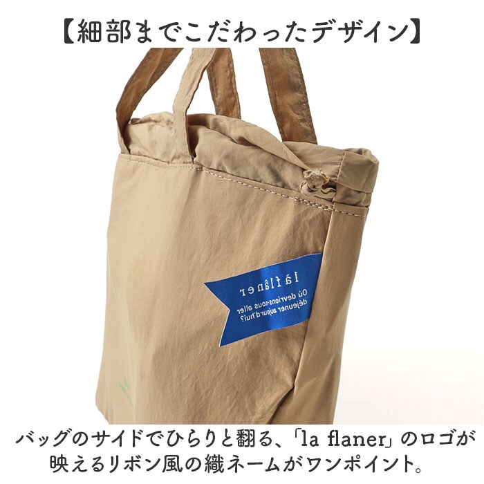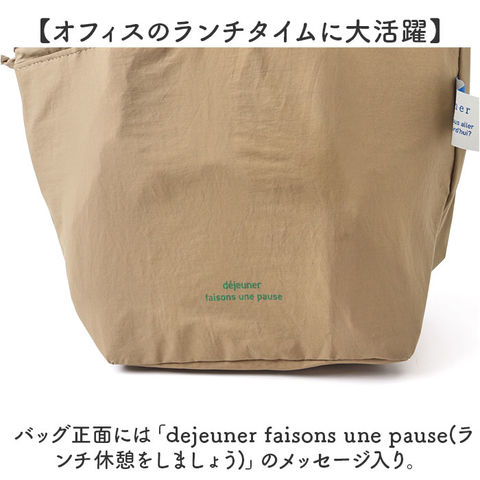 | 商品説明 | 【気軽に持てる、ふんわりフォルム】巾着袋のようなふっくら可愛らしい形がお出掛けスタイルに映える「la flaner ランチバッグ」【ハンドバッグみたいな可愛らしさ】flaner(フラネ)とはフランス語で散歩の意。ふらりとお散歩したい時に気軽に持てるミニバッグ。【ランチやカトラリーがすっぽり】くしゃっとソフトな生地感でもマチ幅たっぷり。お弁当箱や箸箱に、サイドケースもすっぽり入る!【キュッと絞れる巾着タイプ】両サイドのヒモを引っ張って口が絞れる巾着仕様。保冷機能を高めて、食材の新鮮さをキープ。【美味しさ長持ち・保冷補助機能】内側は保冷効果のあるアルミ蒸着シート仕様。保冷剤を入れて食材の新鮮さをしっかりキープ!【サッとひと拭きで簡単キレイ】内側のアルミ蒸着シートははっ水性にも優れており、汚れや水滴がサッと拭き取れてお手入れ簡単!【中身が見えるメッシュポケット】バッグ内側には保冷剤が入るメッシュポケットを装備。コインケースや小物の収納にも便利。【持ち運びに便利なハンドル付き】巾着紐だけでなく、ちょこんと手提げにできるハンドル付きなので、通勤・通学用にもオススメ。【水滴を弾くはっ水加工生地】表生地には水滴や汚れを弾くはっ水加工ナイロンを採用。雨の日のお出掛けやアウトドアでも安心。【オフィスのランチタイムに大活躍】バッグ正面には「dejeuner faisons une pause(ランチ休憩をしましょう)」のメッセージ入り。 【細部までこだわったデザイン】バッグのサイドでひらりと翻る、「la flaner」のロゴが映えるリボン風の織ネームがワンポイント。【ランチが華やぐシンプルカラー】スタイルを選ばないベーシックカラーに、差し色になるビビッドカラーまで豊富にラインナップ。 |
