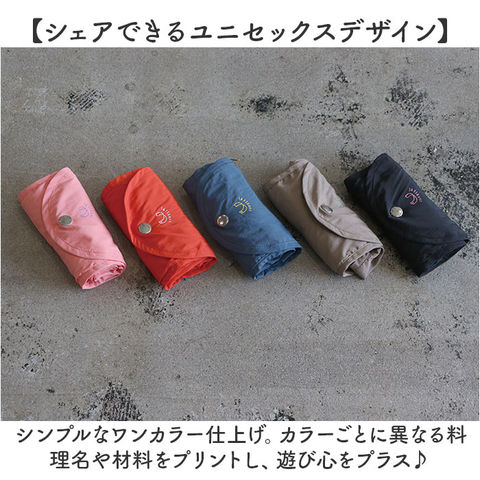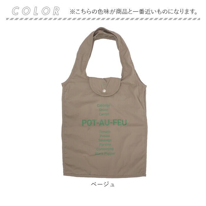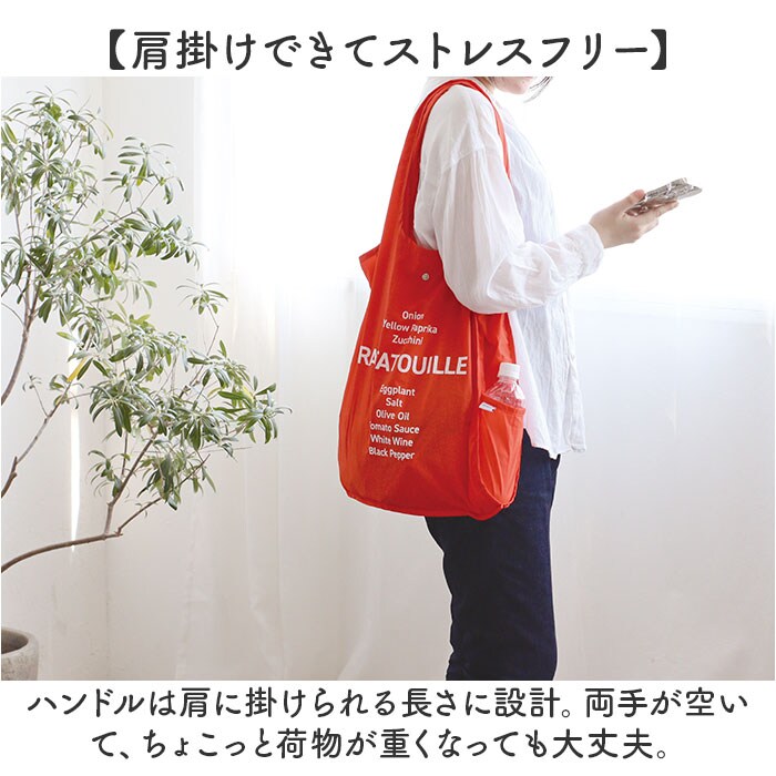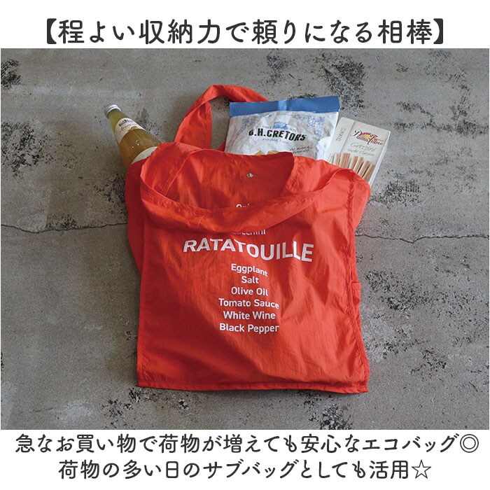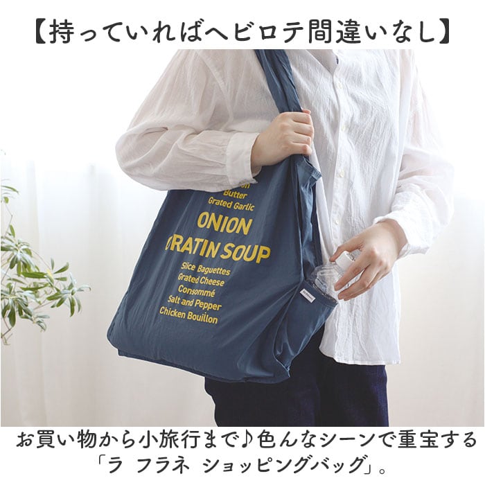 | 商品説明 | 【持っていればヘビロテ間違いなし】お買い物から小旅行まで♪色んなシーンで重宝する「ラ フラネ ショッピングバッグ」。【程よい収納力で頼りになる相棒】急なお買い物で荷物が増えても安心なエコバッグ◎荷物の多い日のサブバッグとしても活用☆【使わない時はスリム&コンパクト】折りたたみ、スナップボタンを留めてひとまとめ。バッグに忍ばせてスマートに持ち歩きOK!【スムーズに開閉&飛び出しガード】いつでも開閉がラクチンなスナップボタン式フラップ。中身がこぼれ落ちる心配も軽減。【肩掛けできてストレスフリー】ハンドルは肩に掛けられる長さに設計。両手が空いて、ちょこっと荷物が重くなっても大丈夫。【サクッと取り出せるサイドポケット】スマホやペットボトル飲料など、すぐに取り出したい小物をINできて便利!【不意の雨に対応できてお手入れ簡単】サラッと軽いナイロン生地に、汚れや水滴を弾く撥水加工済み。お手入れも拭き取るだけ。(※)完全防水ではありません。濡れた場合はすぐに拭き取ってください。【シェアできるユニセックスデザイン】シンプルなワンカラー仕上げ。カラーごとに異なる料理名や材料をプリントし、遊び心をプラス♪【ポケット仕様】サイド:オープンポケット×1 |