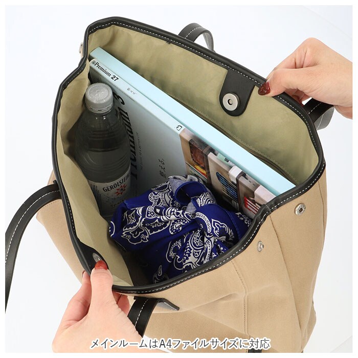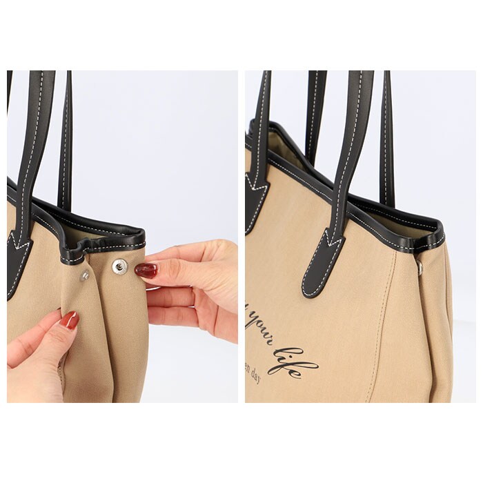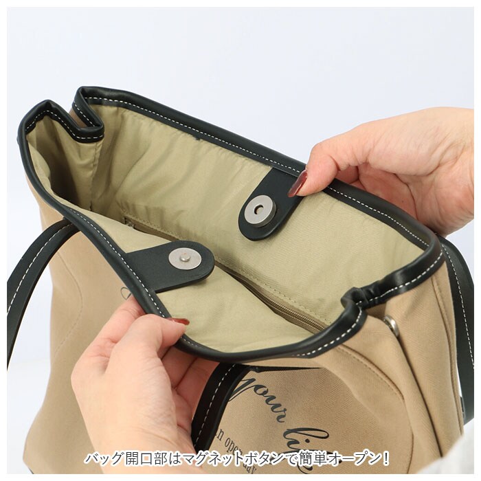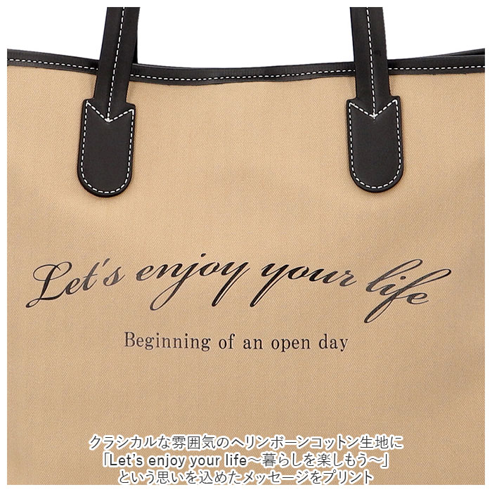| 商品説明 | 出会う人を笑顔にするコトバを持ち歩こう!大人女子に人気のLegato Largoから、ヘリンボーンコットンA4トートが新登場。クラシカルな雰囲気のヘリンボーンコットン生地に「Let’s enjoy your life~暮らしを楽しもう~」という思いを込めたメッセージをプリント。ナチュラルな風合いのコットン素材に、落ち着いた色味のフェイクレザーパーツを合わせることで、カジュアルな雰囲気ながら大人の女性が持てる上品な印象に。バッグ開口部はマグネットボタンで簡単オープン!中の小物が取り出しやすく、外出先でのプライバシーも程よくキープ。メインルームはA4ファイルサイズに対応。余裕のあるマチ幅で、500mlペットボトルやランチボックスもすっぽり収納できるから通勤・通学用のトートに最適!メインルーム内側に長財布やスマホが入る大きめファスナーポケットがあるので、貴重品の収納にオススメ。持ち手ハンドルは、肩掛けにしやすい絶妙な長さに設計し、荷物が少し多めの時でも安心。清々しい1日の始まりに、バッグを持つ人も出会う人も笑顔にする「メッセージバッグ」。ナチュラルな色合いがスタイルを引き立てるカラーバリエーション。 |