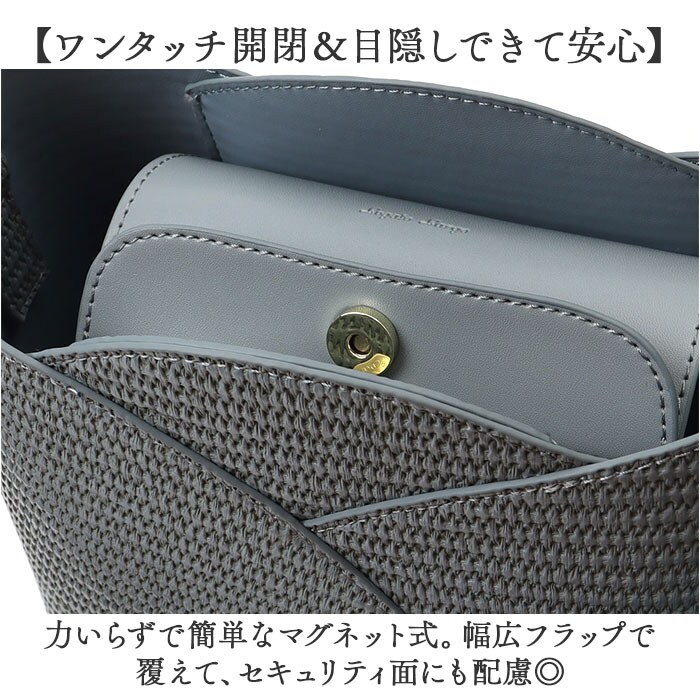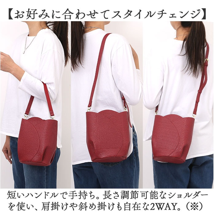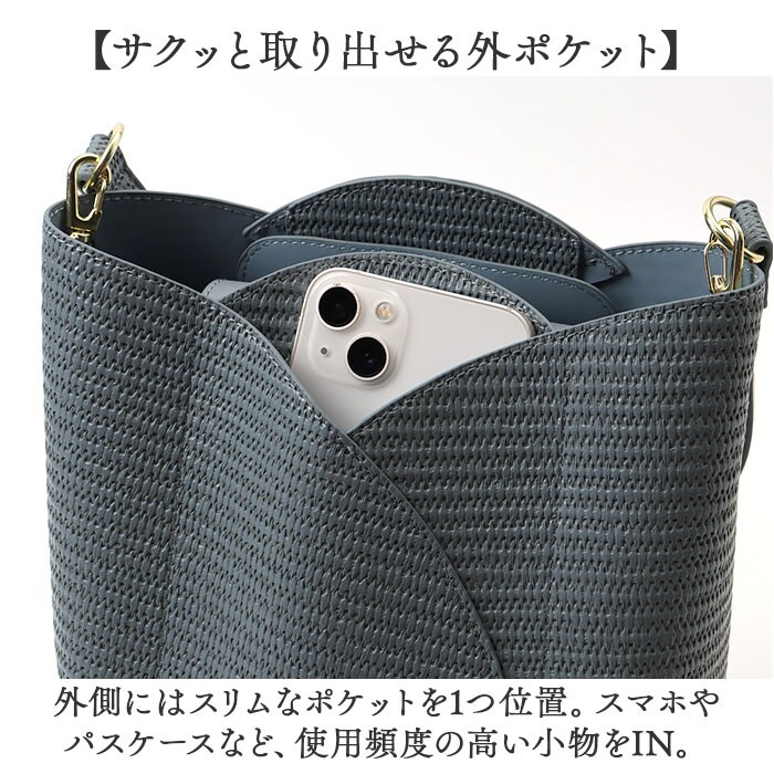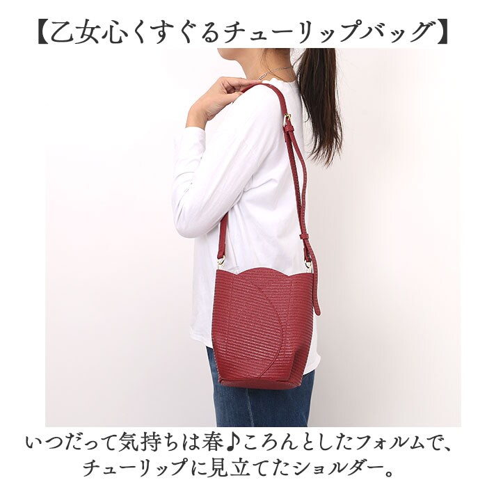 | 商品説明 | 【コーデを彩る可愛いアクセント】気分も晴れやかに!「Legato Largo チューリップバッグ2WAYショルダー」。【乙女心くすぐるチューリップバッグ】いつだって気持ちは春♪ころんとしたフォルムで、チューリップに見立てたショルダー。【春らしさをアップさせるこだわり】柔らかな合皮素材で、カゴのような風合いを表現。爽やかな雰囲気で春気分が高まる♪【軽やかな使い心地でノンストレス】体に負担をかけないよう、軽量化にこだわったつくり。疲れを軽減できるのが嬉しいポイント。【お好みに合わせてスタイルチェンジ】短いハンドルで手持ち。長さ調節可能なショルダーを使い、肩掛けや斜め掛けも自在な2WAY。(※)どちらも付け外し可能です。【ワンタッチ開閉&目隠しできて安心】力いらずで簡単なマグネット式。幅広フラップで覆えて、セキュリティ面にも配慮◎【A5対応ですっきりひとまとめ】A5や500mlペットボトルが縦向きに。マチも設け、マストアイテムを収納できるサイズ感。【サクッと取り出せる外ポケット】外側にはスリムなポケットを1つ位置。スマホやパスケースなど、使用頻度の高い小物をIN。【面倒なお手入れいらずが嬉しい】特別なお手入れは必要なく、汚れなどは拭き取るだけ。デイリーに使えるアイテム。【お気に入りを選べるカラー】ワンポイント使いにぴったりなカラーをラインナップ。おしゃれにお出かけできる相棒☆【ポケット仕様】外側:オープンポケット×1 |