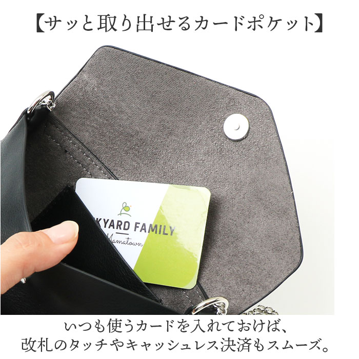 | 商品説明 | 【カジュアルにもキレイめにもマッチ】チェーン使いが可愛い♪「Legato Largo アクセバッグ ポーチショルダー」。【ミニマルスタイルにおすすめ】サッと手に取れて、身軽にお出かけできるサイズ感。パーティーなどのお呼ばれシーンに♪【お好みに合わせてスタイルチェンジ】チェーンは長さ調節可能。肩掛けや斜め掛け、腕に通して手持ちも自在◎【マグネットでワンタッチ開閉】片手で簡単◎力いらずなマグネットボタン式。中身の飛び出しもガード。【スマホなど最低限の貴重品をIN】ちょこっとマチを設けた横長フォルム。コインケースなども収納可能。【サッと取り出せるカードポケット】いつも使うカードを入れておけば、改札のタッチやキャッシュレス決済もスムーズ。【お気に入りを選べるカラー】年代問わず持ちやすく、コーデに合わせやすいカラーをラインナップ☆【ポケット仕様】内側:カードポケット×1 |