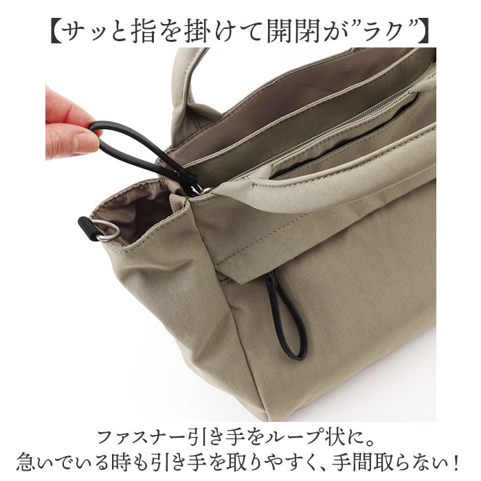 | 商品説明 | 【ナチュラルで”らく”を意識】色んなシーンで素敵に快適!Legato Largo ナチュらくバッグ2WAYショルダー。【ラフに持ち歩けるお出掛けの相棒】あえて金具感を極力なくし、自然体に仕上げたシリーズ。気取らず持ち歩けてコーデに溶け込む♪【サッと指を掛けて開閉が”ラク”】ファスナー引き手をループ状に。急いでいる時も引き手を取りやすく、手間取らない!【雨の日でもお手入れが”ラク”】丈夫なナイロン素材に、汚れや水滴を弾きやすい撥水加工済み。お手入れも拭き取るだけで簡単。(※)完全防水ではありません。【スマホの出し入れが”ラク”】取り出しやすい形状の前面ポケットには、スマホを縦向きに。移動中もノンストレス◎【お好みに合わせてスタイルチェンジ】手持ちで♪長さ調節可能なショルダーを取り付け、肩掛けや斜め掛けもできる2WAY。【開閉スムーズ、安心の天ファスナー】ガバっと開いて取り出しやすく、ファスナーを閉じれば中身の飛び出しをガード。【A5対応でざっくりひとまとめ】A5が横向きに。程よいマチと深さを設け、ポーチやエチケットグッズ等、見た目以上の収納力。【用途に合わせて使えるポケット】前面ポケット含め、合計5つのポケット。500mlペットボトルや小物をすっきり整頓。【お気に入りを選べるカラー】ベーシックや差し色など、落ち着きのあるカラーをラインナップ。飽きが来ず、長く愛用◎【ポケット仕様】内側:オープンポケット×1、ボトルポケット×1前面:オープンポケット×1(スマホ収納)最前面:ファスナーポケット×1背面:オープンポケット×1 |