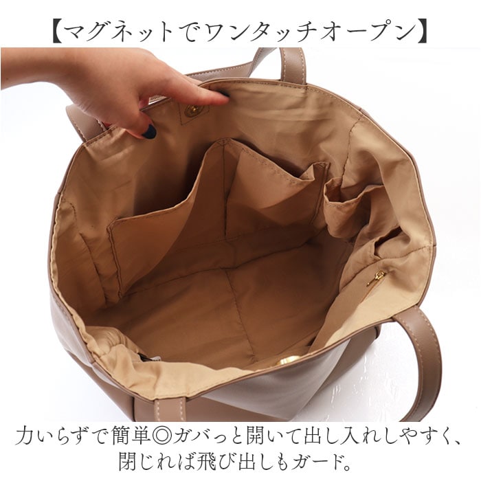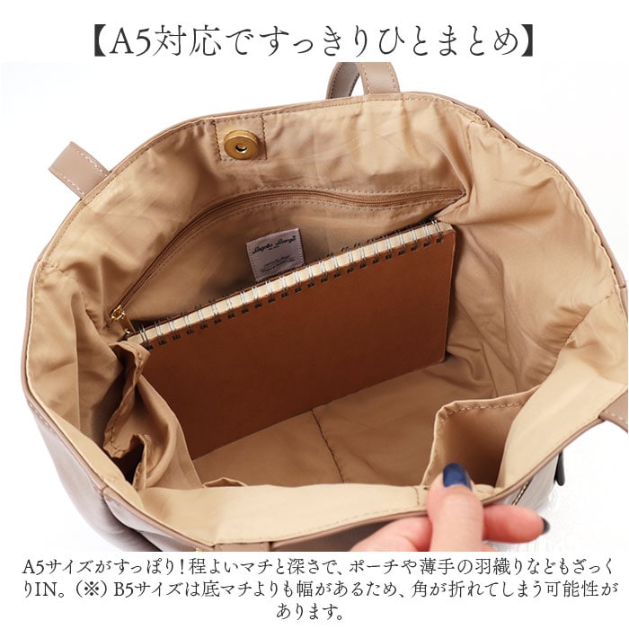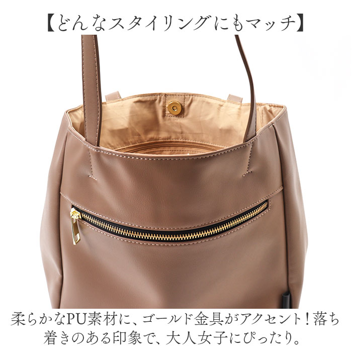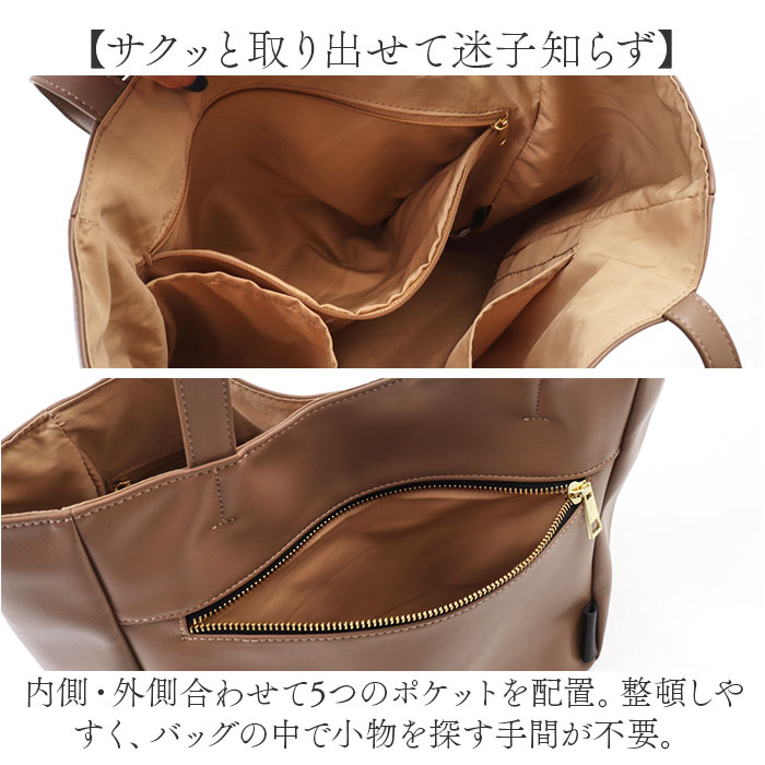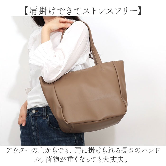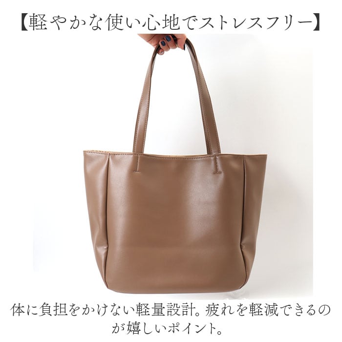 | 商品説明 | 【お出かけの相棒にぴったり】色んなシーンでヘビロテ間違いなし♪「Legato Largo アーバンPU トート」。【どんなスタイリングにもマッチ】柔らかなPU素材に、ゴールド金具がアクセント!落ち着きのある印象で、大人女子にぴったり。【肩掛けできてストレスフリー】アウターの上からでも、肩に掛けられる長さのハンドル。荷物が重くなっても大丈夫。【マグネットでワンタッチオープン】力いらずで簡単◎ガバっと開いて出し入れしやすく、閉じれば飛び出しもガード。【A5対応ですっきりひとまとめ】A5サイズがすっぽり!程よいマチと深さで、ポーチや薄手の羽織りなどもざっくりIN。(※)B5サイズは底マチよりも幅があるため、角が折れてしまう可能性があります。【サクッと取り出せて迷子知らず】内側・外側合わせて5つのポケットを配置。整頓しやすく、バッグの中で小物を探す手間が不要。【軽やかな使い心地でストレスフリー】体に負担をかけない軽量設計。疲れを軽減できるのが嬉しいポイント。【お気に入りを選べるカラー】年代問わず持ちやすいカラーリング。飽きが来ず、長く愛用できるシンプルデザイン!【ポケット仕様】内側:オープンポケット×2、ボトルポケット×1、ファスナーポケット×1前面:ファスナーポケット×1 |