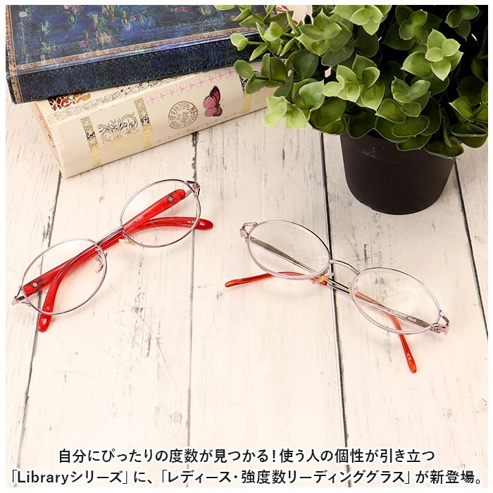 ライブラリー 強度数 読書グラス【ピンクレッド】【度数+5.00】