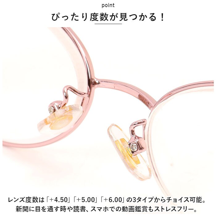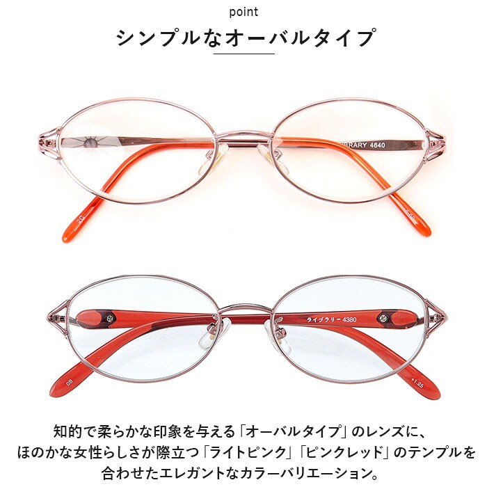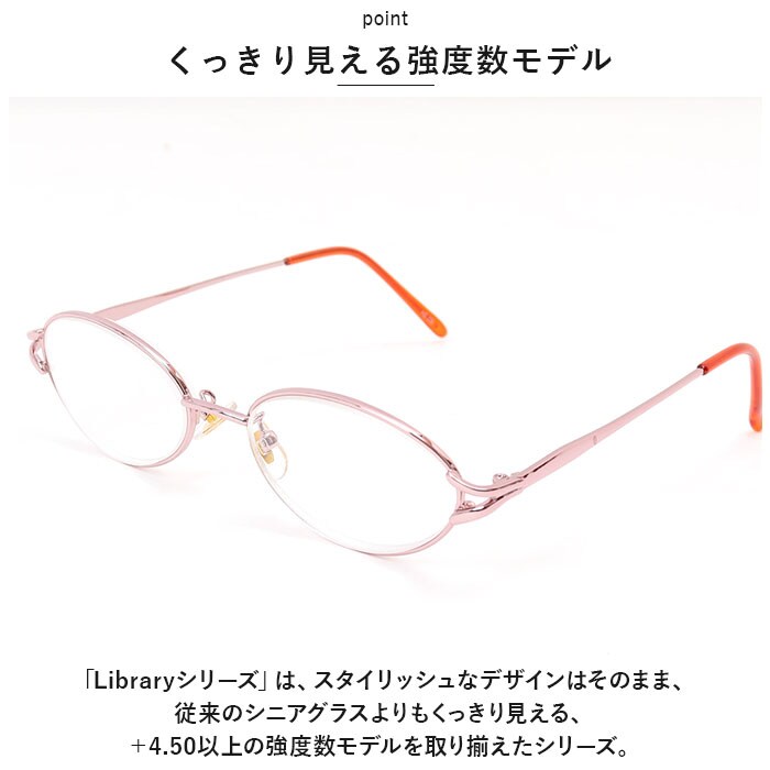 | 商品説明 | 自分にぴったりの度数が見つかる!使う人の個性が引き立つ「Libraryシリーズ」に、「レディース・強度数リーディンググラス」が新登場。【くっきり見える強度数モデル】・「Libraryシリーズ」は、スタイリッシュなデザインはそのまま、従来のシニアグラスよりもくっきり見える、+4.50以上の強度数モデルを取り揃えたシリーズ。【軽やかな掛け心地】耳に掛けるテンプルとモダンは滑らかなシェイプのポリカーボネート素材で一体成型。耳に優しく、軽やかな掛け心地。【クリアな非球面レンズ】厚みを抑え、表面をフラットに仕上げた非球面レンズを採用。レンズ自体の軽さに加えて、歪みのないクリアな視界を実現。【ぴったり度数が見つかる!】レンズ度数は「+4.50」「+5.00」「+6.00」の3タイプからチョイス可能。新聞に目を通す時や読書、スマホでの動画鑑賞もストレスフリー。【シンプルなオーバルタイプ】知的で柔らかな印象を与える「オーバルタイプ」のレンズに、ほのかな女性らしさが際立つ「ライトピンク」「ピンクレッド」のテンプルを合わせたエレガントなカラーバリエーション。 |