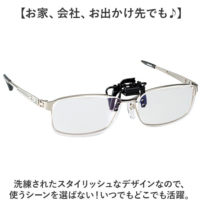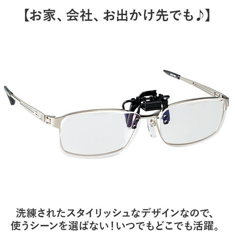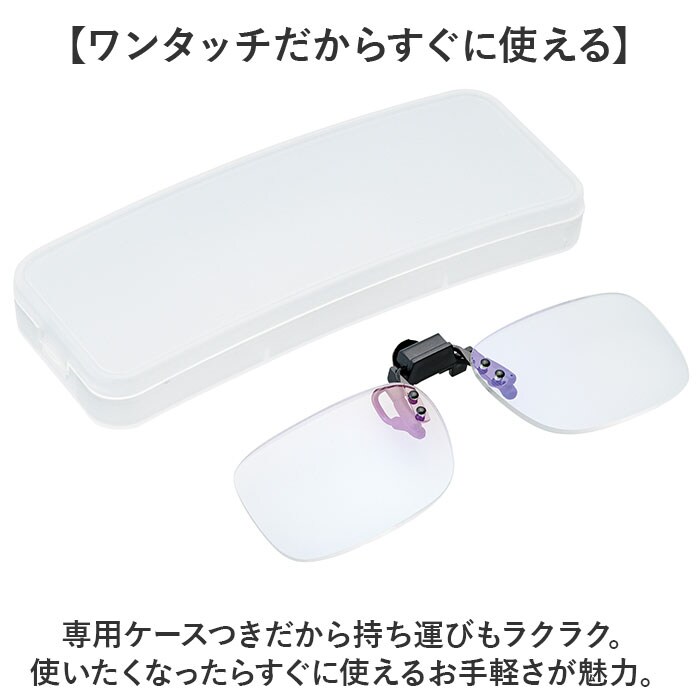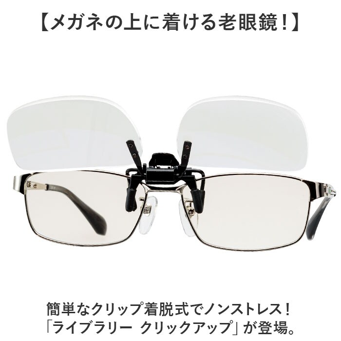 | 商品説明 | 【メガネの上に着ける老眼鏡!】簡単なクリップ着脱式でノンストレス!「ライブラリー クリックアップ」が登場。【メガネ→老眼鏡のかけ直しが不要◎】お手持ちのメガネにクリップを挟むだけ!跳ね上げ式だから着脱の手間が無く、ノンストレス!【お家、会社、お出かけ先でも♪】洗練されたスタイリッシュなデザインなので、使うシーンを選ばない!いつでもどこでも活躍。【ワンタッチだからすぐに使える】専用ケースつきだから持ち運びもラクラク。使いたくなったらすぐに使えるお手軽さが魅力。【面倒な老眼鏡をもっと便利に!】老眼鏡をどこに置いたっけ…付け外しでレンズが汚れた…などのストレスとさよならできる!【安心のブルーライトカット機能】ブルーライトを約20%カットするレンズを採用。スマホやPC作業にもぴったりの作り。 |
