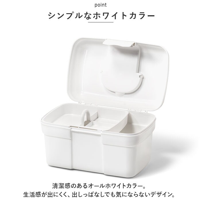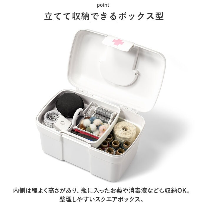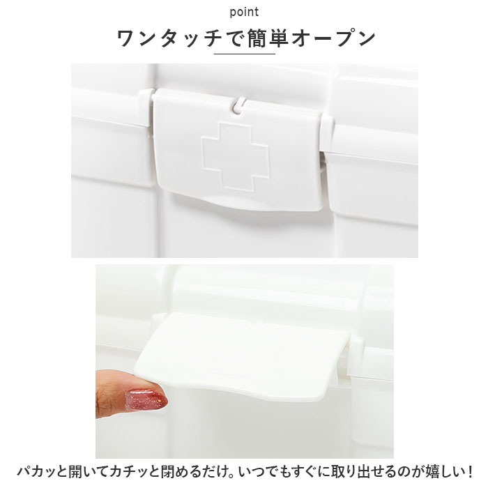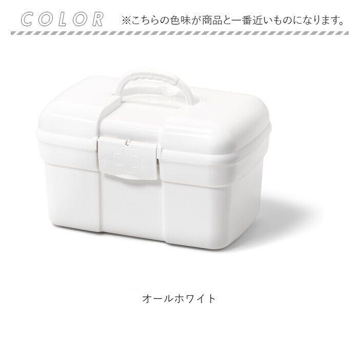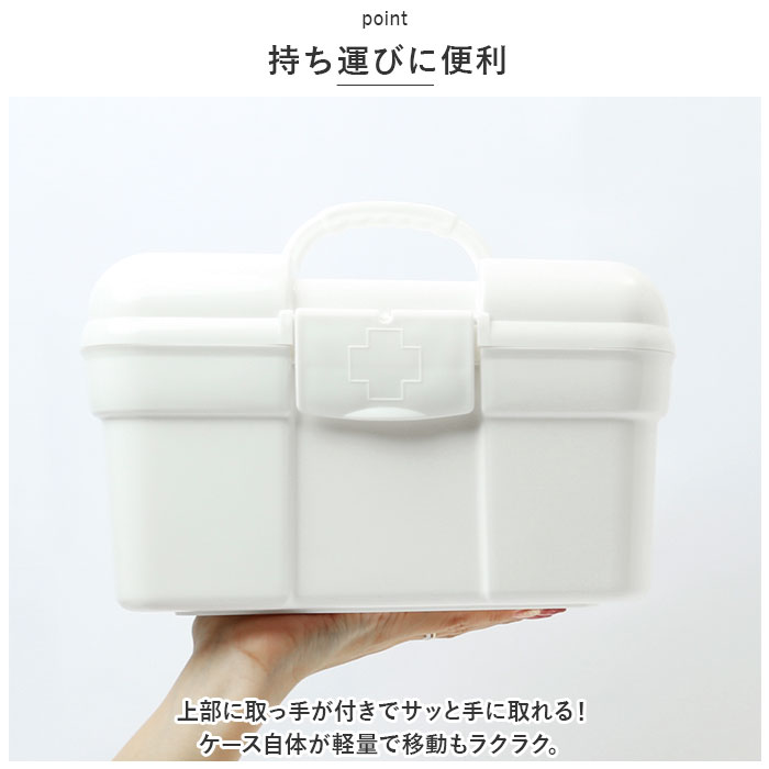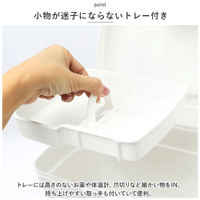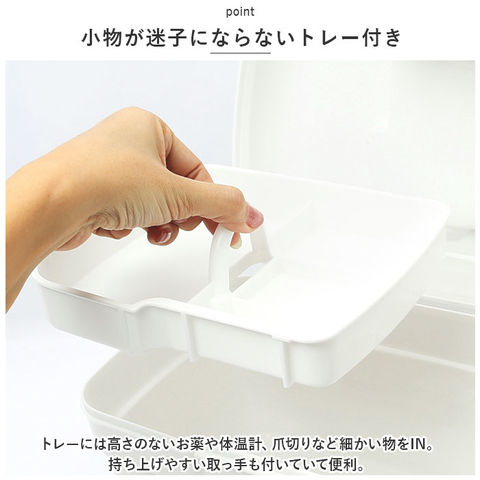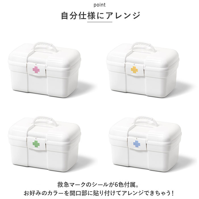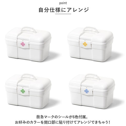 | 商品説明 | 常備薬や救急セットをすっきり整理整頓♪「トレー付きキャリングケース」が新登場。【ワンタッチで簡単オープン】パカッと開いてカチッと閉めるだけ。いつでもすぐに取り出せるのが嬉しい!【立てて収納できるボックス型】内側は程よく高さがあり、瓶に入ったお薬や消毒液なども収納OK。整理しやすいスクエアボックス。【小物が迷子にならないトレー付き】トレーには高さのないお薬や体温計、爪切りなど細かい物をIN。持ち上げやすい取っ手も付いていて便利。【持ち運びに便利】上部に取っ手が付きでサッと手に取れる!ケース自体が軽量で移動もラクラク。【シンプルなホワイトカラー】清潔感のあるオールホワイトカラー。生活感が出にくく、出しっぱなしでも気にならないデザイン。【自分仕様にアレンジ】救急マークのシールが6色付属。お好みのカラーを開口部に貼り付けてアレンジできちゃう! |