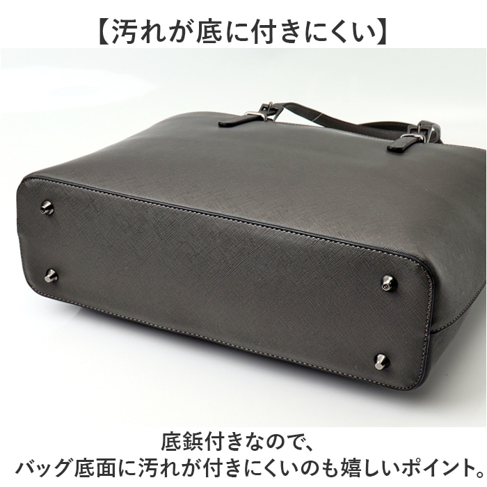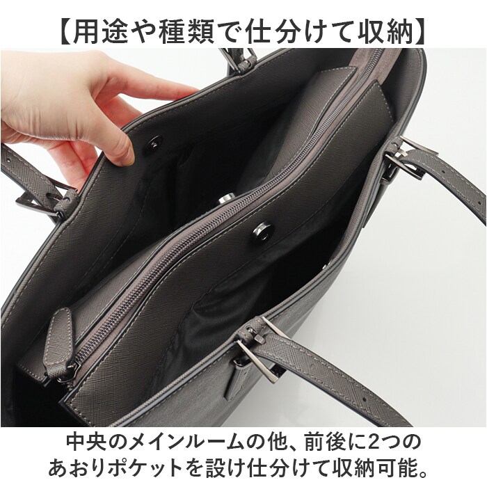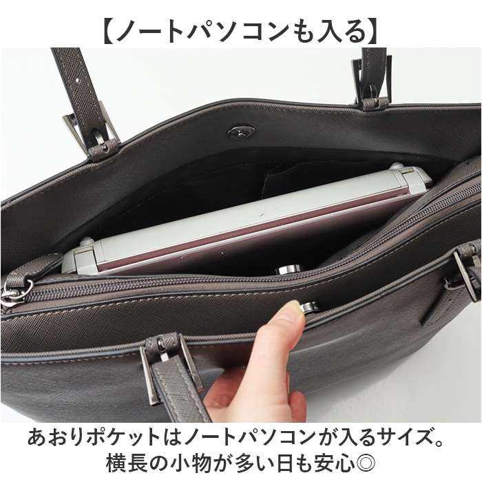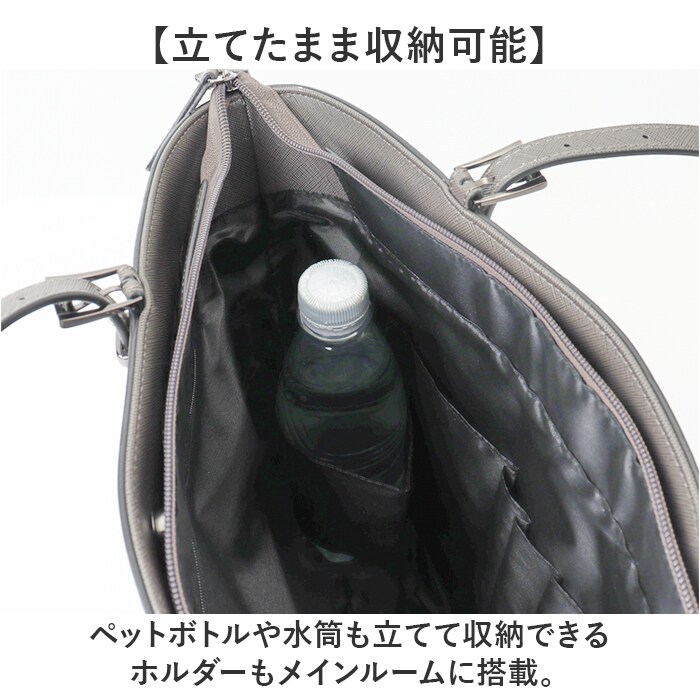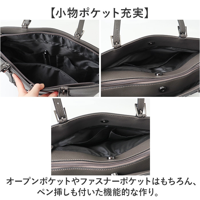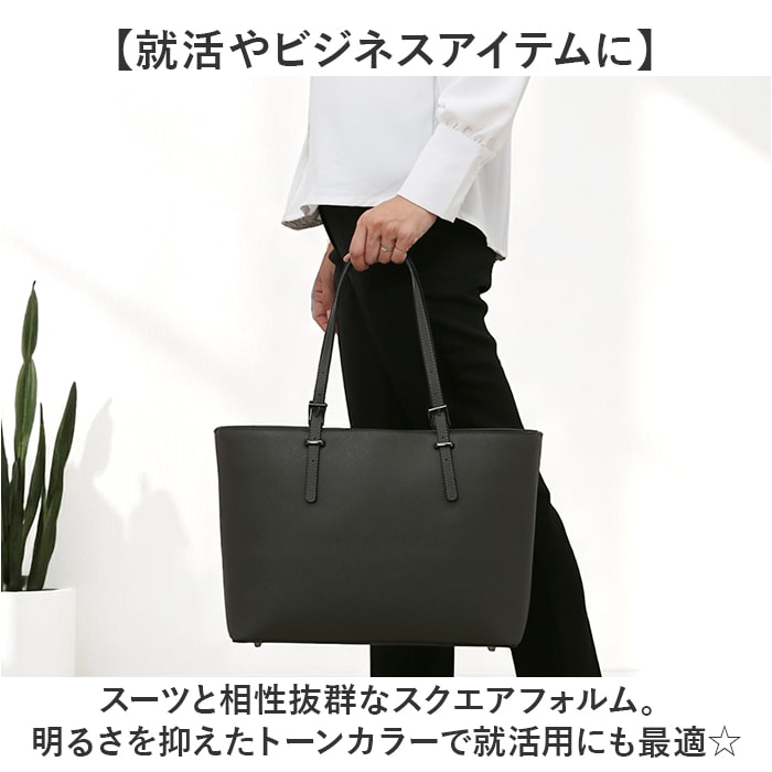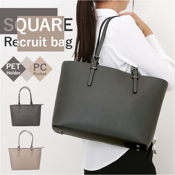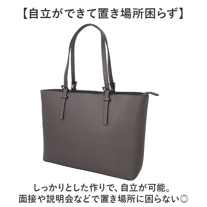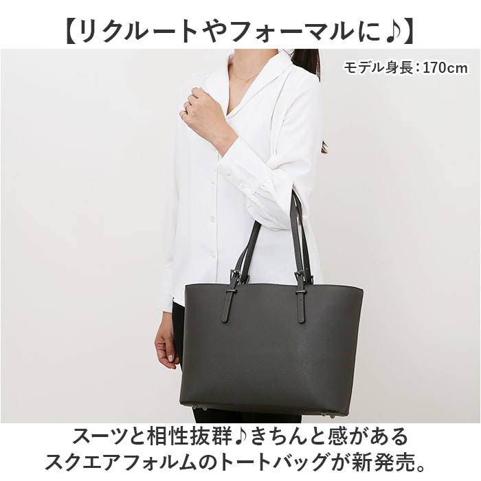 | 商品説明 | 【リクルートやフォーマルに♪】スーツと相性抜群♪きちんと感があるスクエアフォルムのトートバッグが新発売。【就活やビジネスアイテムに】スーツと相性抜群なスクエアフォルム。明るさを抑えたトーンカラーで就活用にも最適☆【学校行事の参列や説明会にも】A4ファイルが入るサイズで、案内書や手続きの書類も折らずに収納可能。【光沢感を抑えたマット調】光沢感が少なく落ち着いた印象の角シボ加工済み。マットかつレザー調の見た目がGOOD。【用途や種類で仕分けて収納】中央のメインルームの他、前後に2つのあおりポケットを設け仕分けて収納可能。【ノートパソコンも入る】あおりポケットはノートパソコンが入るサイズ。横長の小物が多い日も安心◎【小物ポケット充実】オープンポケットやファスナーポケットはもちろん、ペン挿しも付いた機能的な作り。【立てたまま収納可能】ペットボトルや水筒も立てて収納できるホルダーもメインルームに搭載。【定期やスマホ入れに】スマホや定期入れが丁度よく収まるサイズのポケットを背面に配置。【調節ができる肩掛けハンドル】ハンドルは肩掛けができる長さ。アウターの種類や自分のサイズに合わせて調節可能。【自立ができて置き場所困らず】しっかりとした作りで、自立が可能。面接や説明会などで置き場所に困らない◎【汚れが底に付きにくい】底鋲付きなので、バッグ底面に汚れが付きにくいのも嬉しいポイント。【ポケット仕様】メインルーム・・・ファスナーポケット×1、オープンポケット×2、ペン挿し×3、ホルダー×1前あおりポケット・・・オープンポケット×1後あおりポケット・・・オープンポケット×2背面・・・ファスナーポケット×1 |