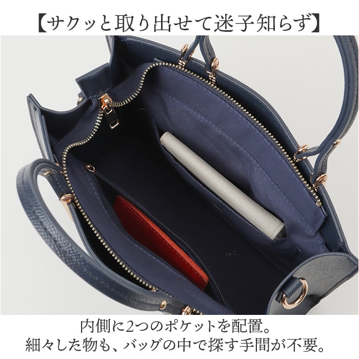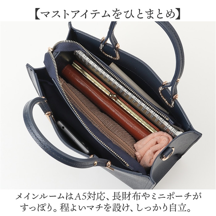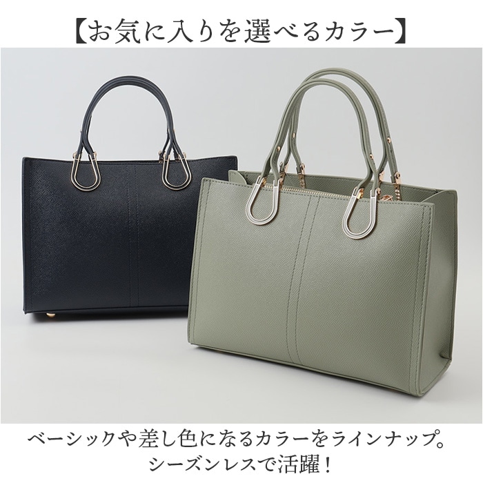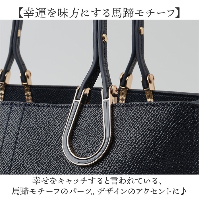 | 商品説明 | 【ヘビロテ間違いなし!大人のバッグ】色んなコーデに合わせやすく、幅広く使えて万能◎「エポメタルカラー 2Wayバッグ」。【オン・オフ問わず使えるデザイン】通勤もお出かけもこれ1つ!シボ合皮素材を使った、シンプルで上品な仕上がり。【幸運を味方にする馬蹄モチーフ】幸せをキャッチすると言われている、馬蹄モチーフのパーツ。デザインのアクセントに♪【お好みに合わせてスタイルチェンジ】手持ちで。長さ調節可能なショルダーを取り付け、肩掛けや斜め掛けも自在な2way。【整理整頓しやすい3層構造】メインルームの他、前後にあおりポケットを装備した3層構造。荷物を定位置に収めやすい◎【開閉スムーズ、安心の天ファスナー】ガバっと開いて取り出しやすく、ファスナーを閉じれば中身の飛び出しをガード。【マストアイテムをひとまとめ】メインルームはA5対応、長財布やミニポーチがすっぽり。程よいマチを設け、しっかり自立。【サクッと取り出せて迷子知らず】内側に2つのポケットを配置。細々した物も、バッグの中で探す手間が不要。【スマートにまとまるあおりポケット】スマホやパスケースなど、スリムな小物をIN。使用頻度の高い小物も、サッと出し入れ◎【軽やかな使い心地でストレスフリー】型崩れしにくいスクエアフォルムながら、手に取りやすい軽量設計。体にかかる負担も軽減。【底面の擦れを軽減して長持ち】底面四隅には、傷や汚れが付きにくい底鋲を装備。直置きも安心。【お気に入りを選べるカラー】ベーシックや差し色になるカラーをラインナップ。シーズンレスで活躍!【ポケット仕様】内側:オープンポケット×1、ファスナーポケット×1メインルーム前後:あおりポケット×2 |