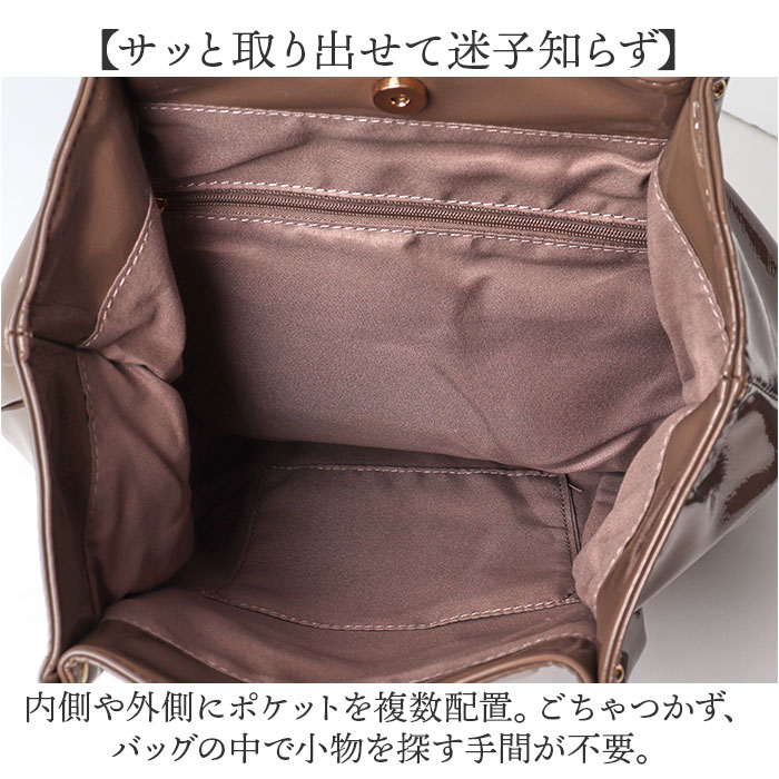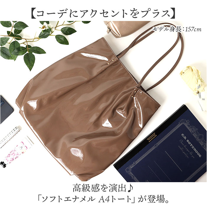 | 商品説明 | 【コーデにアクセントをプラス】高級感を演出♪「ソフトエナメル A4トート」が登場。【エナメルの上品なツヤ感】衣料用のソフトエナメルを使用。滑らかな手触りと程よい光沢感がポイント。【手軽に持ち出せて使い心地軽やか】体に負担がかかりにくい軽量設計。お出かけの相棒にぴったり☆【マグネットでワンタッチ開閉】片手で簡単◎力いらずなマグネットボタン式。中身の飛び出しもガード。【A4サイズ対応のスクエア型】・A4サイズが横向きにすっぽり。マチと深さがちょうど良く、マイボトルなどもすっきりIN。【サッと取り出せて迷子知らず】内側や外側にポケットを複数配置。ごちゃつかず、バッグの中で小物を探す手間が不要。【お気に入りを選べるカラー】ワントーンでも映える絶妙カラー。アクセントにもなる大人好みの色展開。 |