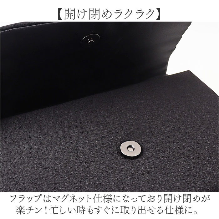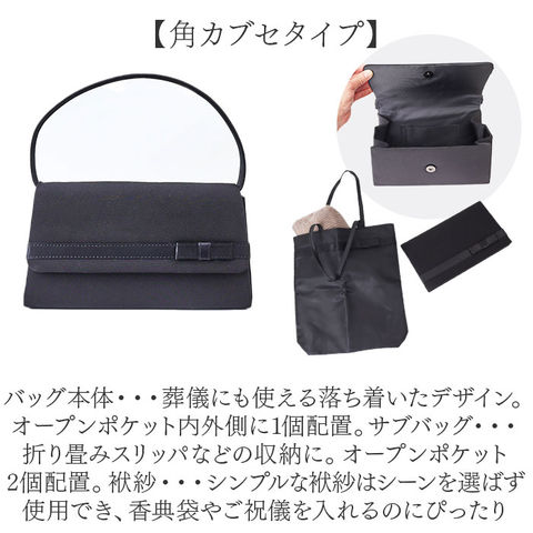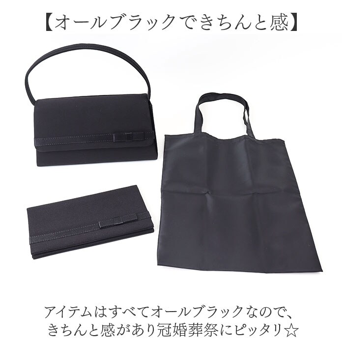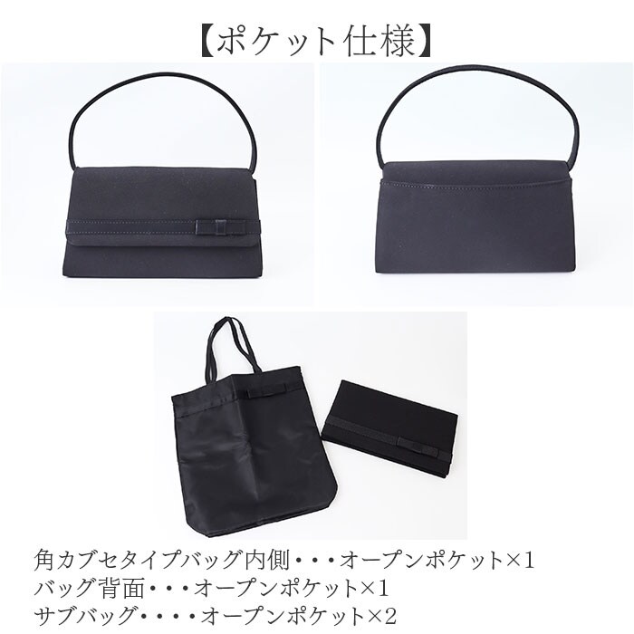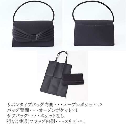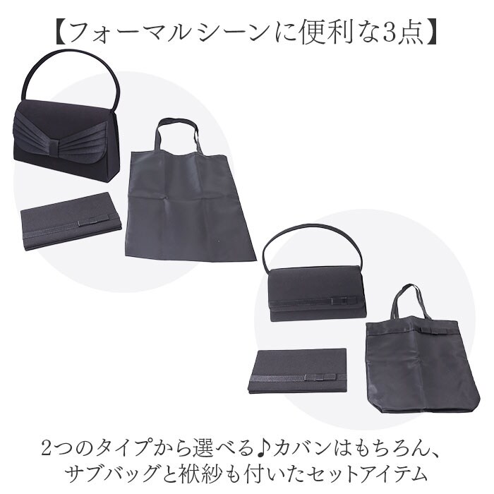 | 商品説明 | 【フォーマルシーンに便利な3点】・2つのタイプから選べる♪カバンはもちろん、サブバッグと袱紗も付いたセットアイテム【2つのタイプをご用意】葬儀にも使える角カブセタイプと、華やかなシーンで使えるサテンリボンが付いたリボンタイプ【オールブラックできちんと感】アイテムはすべてオールブラックなので、きちんと感があり冠婚葬祭にピッタリ☆【角カブセタイプ】バッグ本体・・・葬儀にも使える落ち着いたデザイン。オープンポケット内外側に1個配置。サブバッグ・・・折り畳みスリッパなどの収納に。オープンポケット2個配置。袱紗・・・シンプルな袱紗はシーンを選ばず使用でき、香典袋やご祝儀を入れるのにぴったり【リボンタイプ】バッグ本体・・・サテンの大きなリボンがポイント☆内側に2つ、外側に1つポケット付きサブバッグ・・・A4用紙がすっぽり入る◎パンフレットや書類入れにも。袱紗・・・シンプルな袱紗はシーンを選ばず使用でき、香典袋やご祝儀を入れるのにぴったり【どちらのタイプも自立可能】底鋲付きでしっかりとした作りなので、バッグは自立ができ置き場所に困らない☆【開け閉めラクラク】フラップはマグネット仕様になっており開け閉めが楽チン!忙しい時もすぐに取り出せる仕様に。【ポケット仕様】角カブセタイプバッグ内側・・・オープンポケット×1バッグ背面・・・オープンポケット×1サブバッグ・・・・オープンポケット×2リボンタイプバッグ内側・・・オープンポケット×2バッグ背面・・・オープンポケット×1サブバッグ・・・・ポケットなし袱紗(共通)フラップ内側・・・スリット×1 |