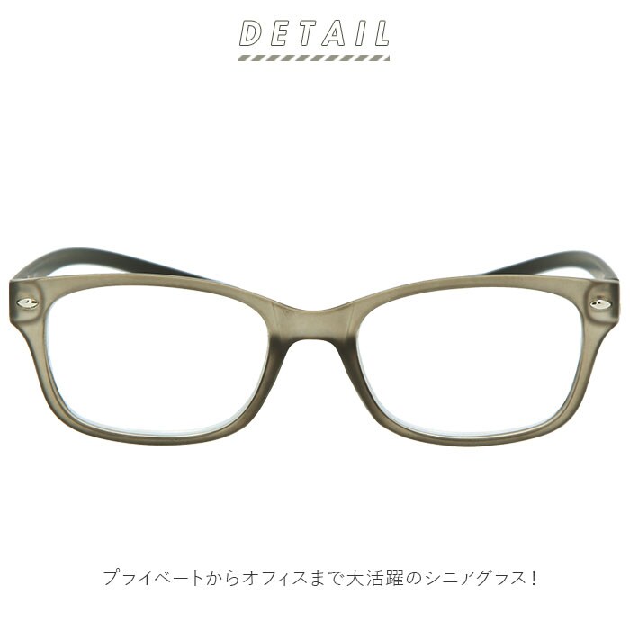 | 注意点 | 年齢による度数の目安(度数には個人差があります)[40-45歳]+1.00[46-50歳]+1.50[51-55歳]+2.00[56-60歳]+2.50[61-65歳]+3.00[65歳以上]+3.50本製品は視力補正用のメガネです。見づらくなった手元の文字等を見やすくすることを目的に作られております。運転時や歩行時は必ずはずしてください。また、はずしたメガネはケース等に保管してください。階段の昇り降り、段差のある所での使用はさけてください。プラスチックレンズも強い衝撃があれば破損する可能性がありますので注意してください。使用中に、万一不快感や視力異常等を感じたときは、医師または購入店にご相談ください。汗、整髪料等はメッキのはがれ、変色の原因となることがありますのでご注意ください。また、そのままご使用になると、アレルギー等の原因となることがありますのでご注意ください。定期的に、洗浄、ネジのゆるみ等の点検を行い、ご使用いただくよう、お願いいたします。新聞等を読み、快適で見やすいものをお選びください。左右の度数の違いが大きい人、乱視の人などには向きません。カメラやモニターの性質により、画像と実物の色の違いがある場合がございますのでご理解願います。 |