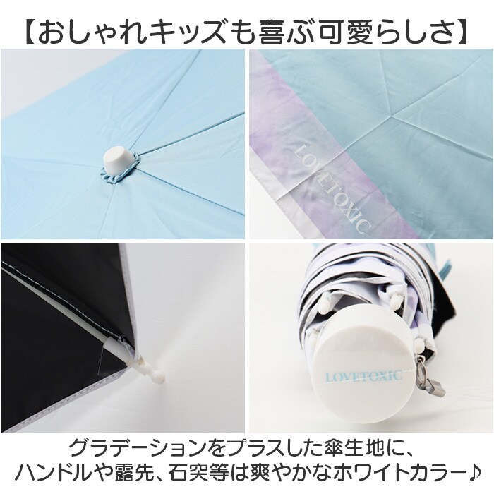 | 商品説明 | 【雨の日も晴れの日も頼れる味方】天候に関係なく、バッグに忍ばせてお出かけ!「LOVETOXIC 折傘 雨晴兼用傘」。【いつでもどこでもイージーオープン】傘骨をポキポキ折る手間なく、スムーズに開閉できる手開き仕様。【安心・安全のセーフガード機能】爪や指を挟むのを防止するカバーを装備。開閉時のケガを防ぎ、ネイルを施した爪も保護。【しなやかで丈夫なグラスファイバー】親骨は弾力性のある素材。折れにくいのに、使い心地は軽やか。【雨の日も安心の防水・はっ水加工】傘生地には防水・はっ水加工を施しており、雨をしっかりガードできる折りたたみ傘。【日傘としても使える万能アイテム】UVカット率&遮光率99%以上!日差しからお肌を守れて、晴れの日にも重宝。(※)裏面はポリウレタンコーティング済みです。【サクッと留められるボタン式バンド】傘生地を留めるバンドは、バチンっと留めやすいスナップボタン式。【持ち運びに便利なトート型収納袋】傘生地と同じカラーの、スナップボタン式収納袋付き。サッとまとめ、腕に掛けて持ち歩きも。【おしゃれキッズも喜ぶ可愛らしさ】グラデーションをプラスした傘生地に、ハンドルや露先、石突等は爽やかなホワイトカラー♪ |