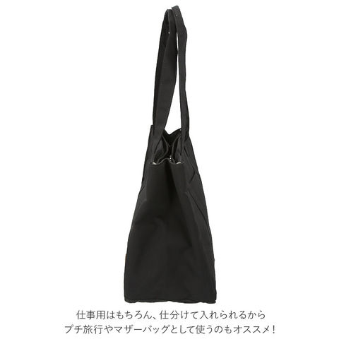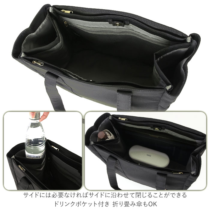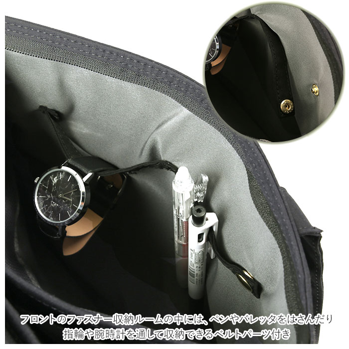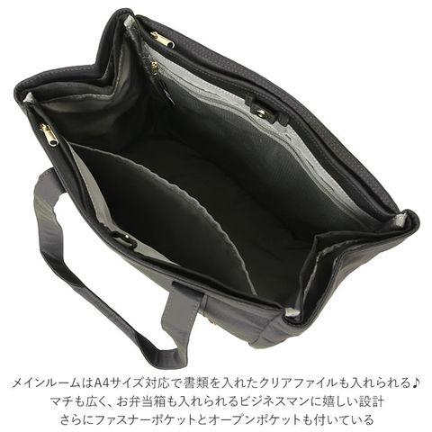 | 商品説明 | Legato Largo(レガートラルゴ)から中が見えやすいトートバッグが登場。年間150時間もバッグの中身を探しているビジネスマン、そんな時間を時短できるようにバッグ内を見えやすく持ち物の定位置を決めやすくしたこだわりのアイテムシリーズ。メインルームはA4サイズ対応。書類を入れたクリアファイルも入れられる♪マチも広く、お弁当箱も入れられるビジネスマンに嬉しい設計。さらにファスナーポケットとオープンポケットも付いている。背面のファスナー収納ルームの中は小物を仕分けて入れられる仕切りとキーフック、オープンポケット装備。さらに外側には深すぎずスマホがすっぽり入るポケット付き。フロントのファスナー収納ルームの中には、ペンやバレッタをはさんだり、指輪や腕時計を通して収納できるベルトパーツ付き。またメッシュポケット×2も装備。サイドには必要なければサイドに沿わせて閉じることができるドリンクポケット付き。折り畳み傘もOK。雨や汚れにも強い撥水加工済み。水滴や汚れがついてもサッと拭き取れる。仕事用はもちろん、仕分けて入れられるからプチ旅行やマザーバッグとして使うのもおススメ! |