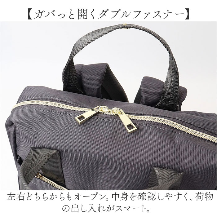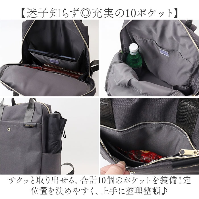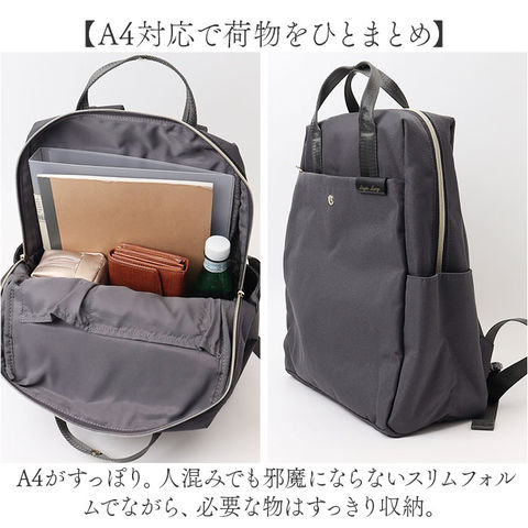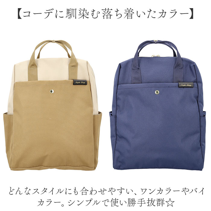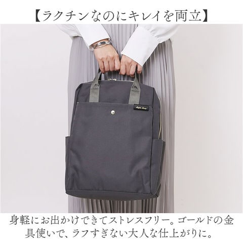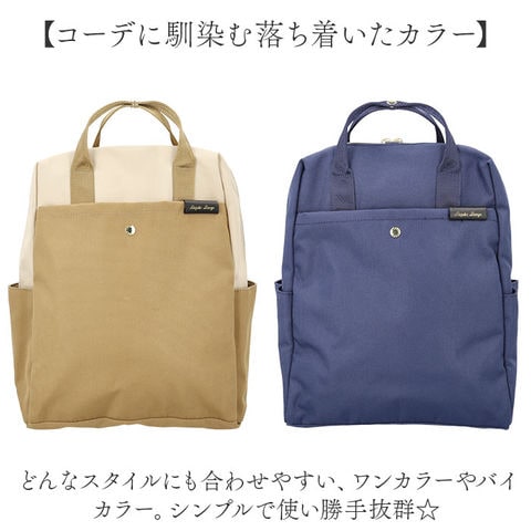 | 商品説明 | 【お仕事と家事を頑張る女性に】デイリーに活躍◎「Legato Largo 撥水両立バッグ トート型リュック」。【ラクチンなのにキレイを両立】身軽にお出かけできてストレスフリー。ゴールドの金具使いで、ラフすぎない大人な仕上がりに。【ガバっと開くダブルファスナー】左右どちらからもオープン。中身を確認しやすく、荷物の出し入れがスマート。【A4対応で荷物をひとまとめ】A4がすっぽり。人混みでも邪魔にならないスリムフォルムでながら、必要な物はすっきり収納。【衝撃から守り安定感もキープ】ソフトな底材をプラス。直置きの衝撃をガードし、安定した状態で持ち運べるつくり。【迷子知らず◎充実の10ポケット】サクッと取り出せる、合計10個のポケットを装備!定位置を決めやすく、上手に整理整頓♪【背負い心地軽やかでストレスフリー】軽量で、ショルダーと背面にはクッション材入り。どちらもムレにくく快適なメッシュ仕様。(※1)ショルダーはワンタッチで着脱できるバックル付きです。【スナップボタンでまとまる持ち手】持ち手付きのトート型。手持ちもしやすく、電車やバスの中などで下ろすシーンでも便利。【晴れの日も雨の日も頼れる相棒】汚れや水滴を弾きやすい、撥水加工を施した素材。お手入れも拭き取るだけ。(※2)完全防水ではありません。【コーデに馴染む落ち着いたカラー】どんなスタイルにも合わせやすい、ワンカラーやバイカラー。シンプルで使い勝手抜群☆【ポケット仕様】内側:オープンポケット×3、ボトルポケット×2、ペンポケット×1前面:ファスナーポケット×1(内側にオープンポケット×1)サイド:オープンポケット×2 |