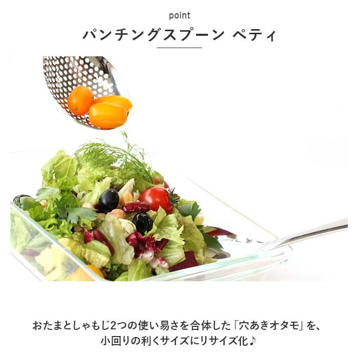 | 商品説明 | 調理から盛り付けまでマルチに使える!「ののじ 穴あきオタモ ペティ」が新登場。【パンチングスプーン ペティ】おたまとしゃもじ2つの使い易さを合体した「穴あきオタモ」を、小回りの利くサイズにリサイズ化♪【18-8ステンレスを使用】入念な磨き仕上げをすることで、ザラつきのない仕上がりに。【パンチングメタル方式の完全一体構造】水切れ・油切れ良く、洗浄がしやすい一体構造設計!目詰まりしにくく、サッと洗えて衛生的。【操作がスムーズ】すくい上げの角度をおさえたデザイン。手首のひねりが少なく、使いやすさにこだわったアイテム。【様々なシーンで活躍!】野菜の油切りや湯切り、味噌溶きやアク取り、鍋料理のサービングなど、ボーダレスに使えちゃう!【食洗機OK】食洗機に対応しており、お手入れがラクチン。 |
