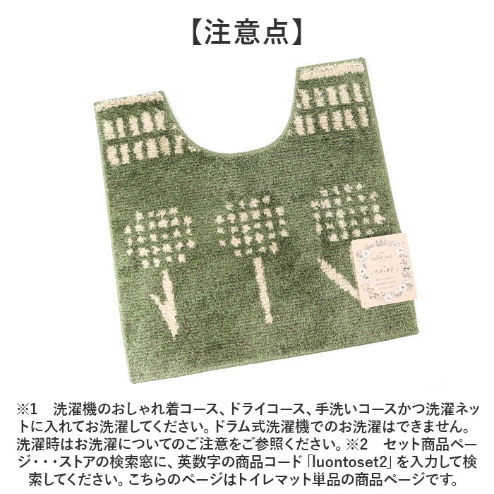 | 商品説明 | 【北欧風ボタニカルで彩る】北欧風のボタニカルデザインで、サニタリールームを温かく彩る「トイレマット」。【サニタリールームを模様替え】ナチュラルカラーを生地全体に採用。いつものサニタリールームが温かみある空間に変身♪【ピッタリはまるスタンダード】上部にくぼみがあり、トイレの形とピッタリはまるスタンダードな形。【ふわふわな触り心地♪】ボリュームあるパイル地を使用し、ふわふわな触り心地が魅力的。【汚れが気になったら洗濯機に】汚れが気になったらそのままネットに入れて洗濯機で丸洗いができるのも嬉しいポイント。※1【ズレにくい滑り止め付き】トイレマットの裏面は滑り止め加工がされており、ズレにくい仕上がり。【セットで使うのもオススメ♪】北欧風デザインがかわいい「ルオント」シリーズ。別ページにてセット販売中※2【注意点】※1 洗濯機のおしゃれ着コース、ドライコース、手洗いコースかつ洗濯ネットに入れてお洗濯してください。ドラム式洗濯機でのお洗濯はできません。洗濯時はお洗濯についてのご注意をご参照ください。※2 セット商品ページ・・・ストアの検索窓に、英数字の商品コード「luontoset2」を入力して検索してください。こちらのページはトイレマット単品の商品ページです。 |