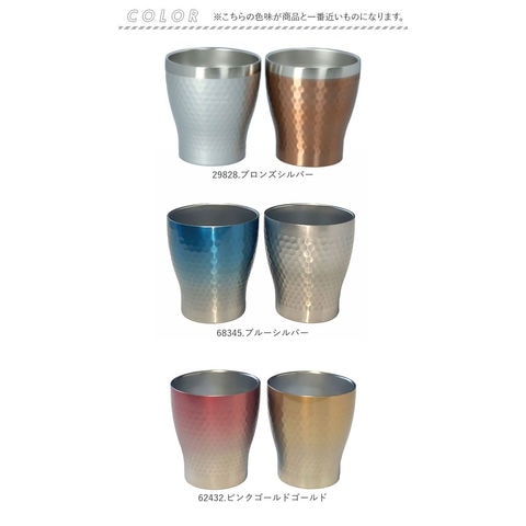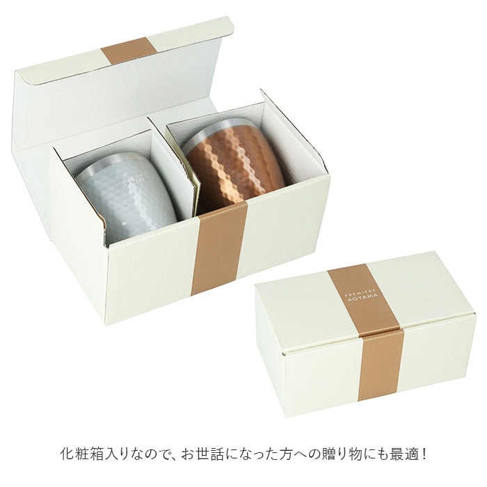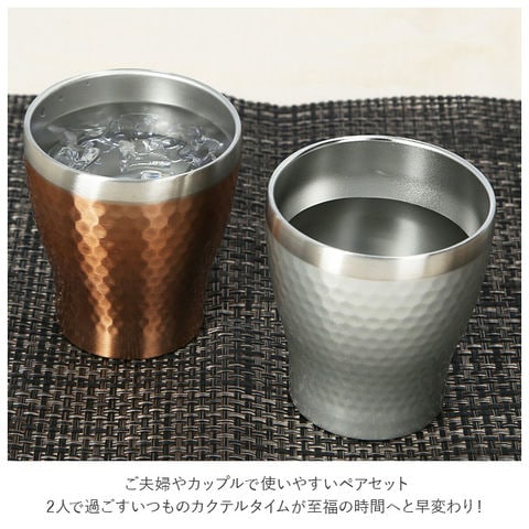 | 商品説明 | いつものコーヒータイムやカクテルタイムが贅沢なひと時に。luxe(リュクス)のペアメタルサーモロックカップ。本体内側と外側が真空断熱されたステンレス二重構造タイプ。熱い飲み物を入れてタンブラーを持っても表面が熱くなく、冷たい飲み物を注いだ時の結露もでにくいのがポイント!表面は高級感のある打ち出し加工仕上げ。ツヤのあるメタリック調で、飲み口がシルバー色に縁取られたスタイリッシュなデザイン。手のひらでちょうど包み込めるほどの程よい容量。ご自宅でカクテルや水割りを楽しむ時だけでなく、オフィスの休憩時間用にもぴったり。ご夫婦やカップルで使いやすいペアセット。2人で過ごすいつものカクテルタイムが至福の時間へと早変わり!化粧箱入りなので、お世話になった方への贈り物にも最適! |