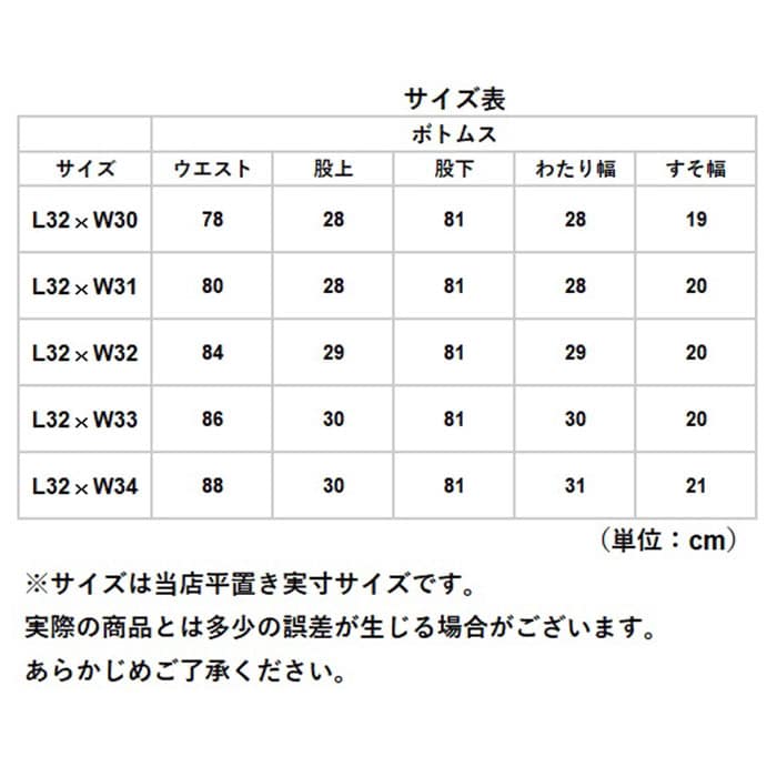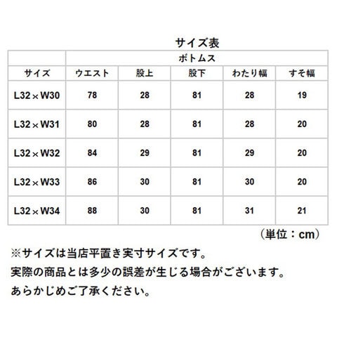 | サイズ | ・L32×W30 ・L32×W31 ・L32×W32 ・L32×W33 ・L32×W34 ※サイズについて詳細は、サイズ表をご覧くださいませ。 |