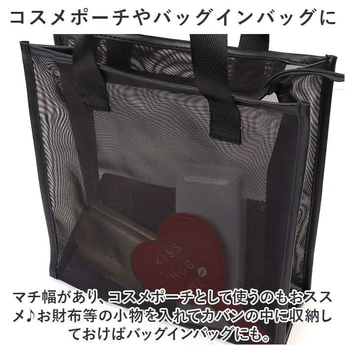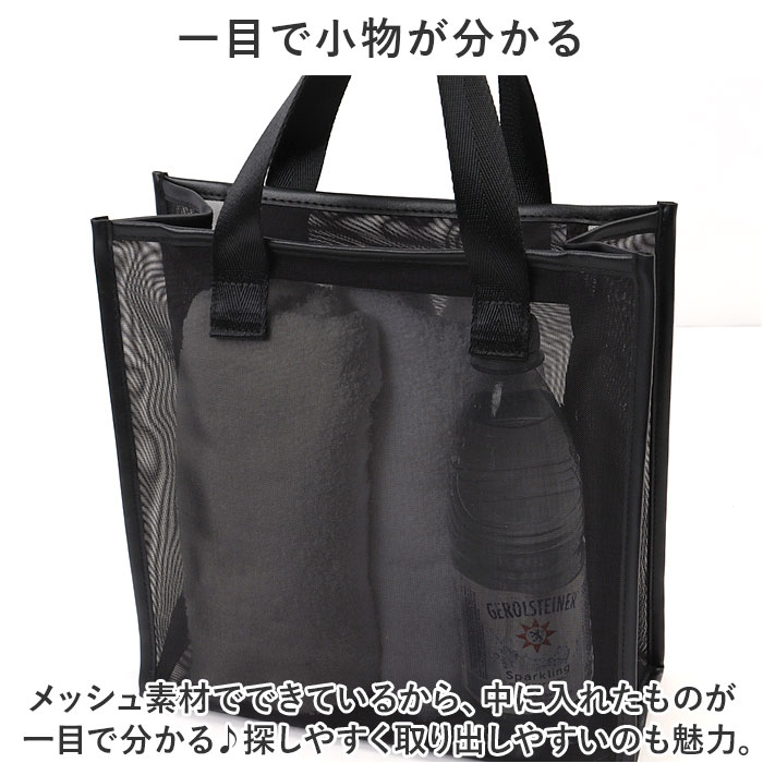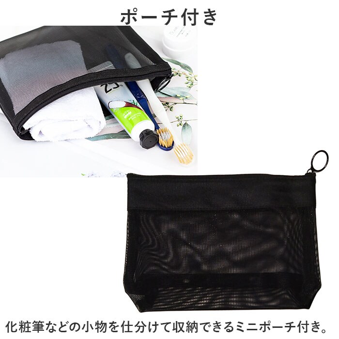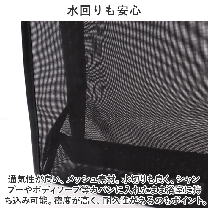| 商品説明 | トラベルやジムに便利なスパバッグが発売♪【一目で小物が分かる】メッシュ素材でできているから、中に入れたものが一目で分かる♪探しやすく取り出しやすいのも魅力。【水回りも安心】通気性が良い、メッシュ素材。水切りも良く、シャンプーやボディソープ等カバンに入れたまま浴室に持ち込み可能。密度が高く、耐久性があるのもポイント。【コスメポーチやバッグインバッグに】マチ幅があり、コスメポーチとして使うのもおススメ♪お財布等の小物を入れてカバンの中に収納しておけばバッグインバッグにも。【ポーチ付き】化粧筆などの小物を仕分けて収納できるミニポーチ付き。 |