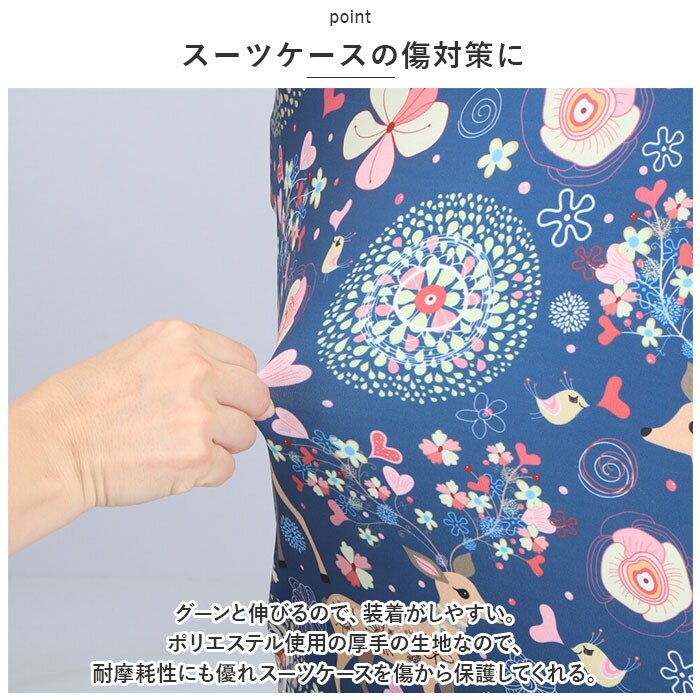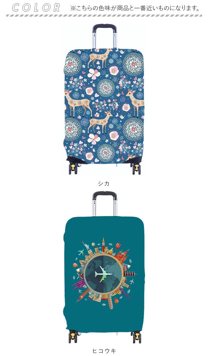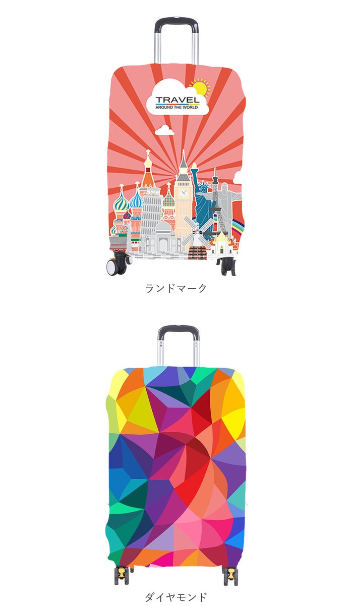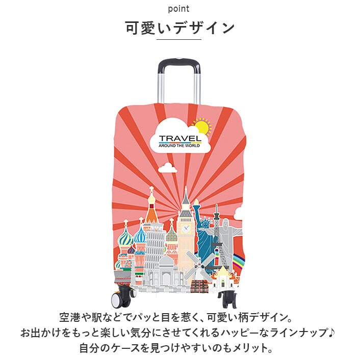 | 商品説明 | おしゃれで可愛いカバーで、スーツケースを保護!グーンと伸びて簡単装着◎「スーツケースカバー」が登場。【スーツケースの傷対策に】グーンと伸びるので、装着がしやすい。ポリエステル使用の厚手の生地なので、耐摩耗性にも優れスーツケースを傷から保護してくれる。【可愛いデザイン】空港や駅などでパッと目を惹く、可愛い柄デザイン。お出かけをもっと楽しい気分にさせてくれるハッピーなラインナップ♪自分のケースを見つけやすいのもメリット。【被せるだけ】スーツケースの上からスポっと被せるだけの簡単装着。下部分のファスナーと、ベルトをカチッと留めればズレの心配もなく、フィット感◎【サイズ、デザインいろいろ】スーツケースのサイズに合わせてチョイスOK!デザインも豊富なのでご家族やカップルでお揃いにするのもGOOD♪ |
