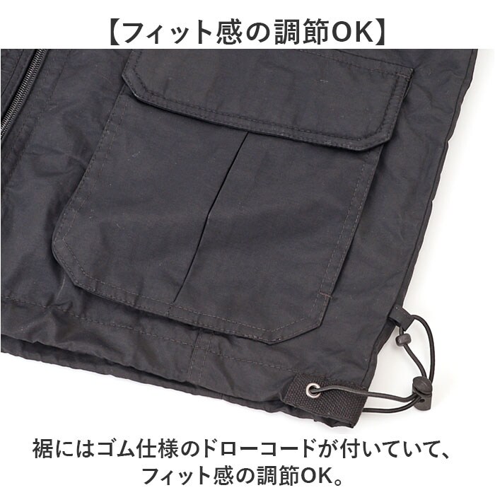 | 商品説明 | 【軽量で機能性抜群!】釣りやキャンプなどアウトドアにピッタリな「多機能ベスト」が登場。【便利なポケットを多数配置】内側や外側にポケットを多数配置した収納力抜群のベスト。【フィット感の調節OK】裾にはゴム仕様のドローコードが付いていて、フィット感の調節OK。【通気性の良いメッシュ生地】通気性が良くムレにくいメッシュ素材を使用しているので、オールシーズン着用可能。【乾きやすくお手入れ簡単】薄手のサラッとした生地は洗濯しても乾きやすくお手入れがしやすいのもポイント。【様々なシーンで活躍】ユニセックスで着用でき、アウトドアレジャーはもちろん、仕事用のベストとしても活躍!【ポケット仕様】フロント上部:ファスナーポケット×2フロント下部:面ファスナー付きポケット×2、オープンポケット×2内側:ファスナーポケット×1 |