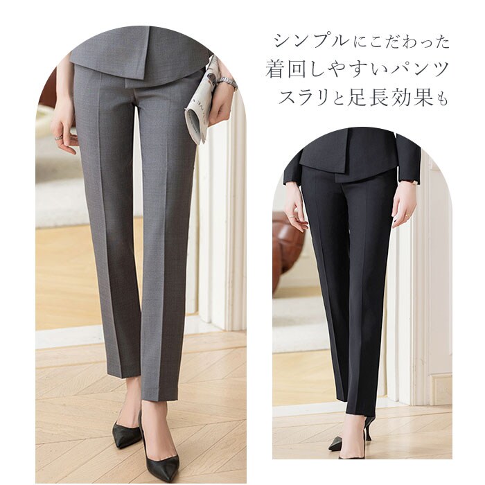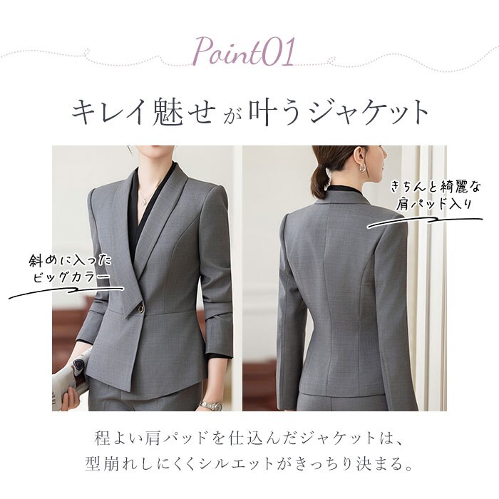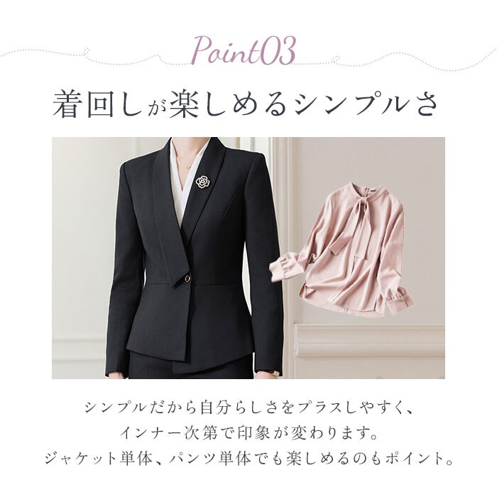 | 商品説明 | ビジネスからフォーマル、リクルートにも使える♪レディーススーツが発売♪【少し大きめのカラー(襟)】少し大きめのカラー(襟)デザインとゴールドが光るボタンがアクセント。あなただけのスーツスタイルがキマル☆【様々なシーンで着こなせる】インナーを変えてビジネス、フォーマル、リクルート、カジュアルスタイルにもフィット。【動きやすいパンツスタイル】ボトムスはパンツスタイルだから動きやすい!外回りが多いビジネスウーマンにもおススメ。【シルエットがキマル】ウェストラインで脚長効果も?!パンツのセンタープレスと、大きすぎない肩パッド入りでシルエットがキレイにキマる♪【オールシーズン仕様】ジャケット内部は袖部分まで裏地が入っているのでオールシーズン仕様なのもポイント。【お子さまの行事にも】華やかなフリルブラウスと組み合わせれば入園、入学式や卒園、卒業式のシーンにもぴったり。 |