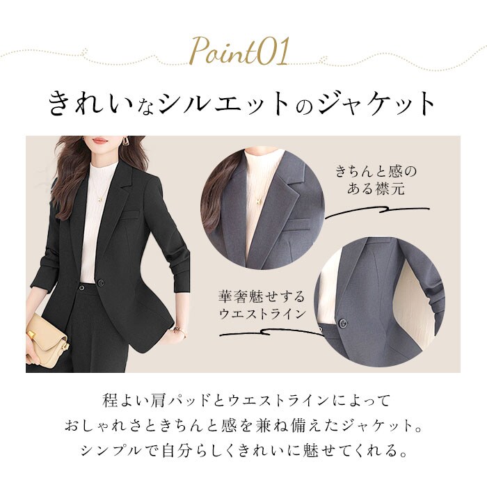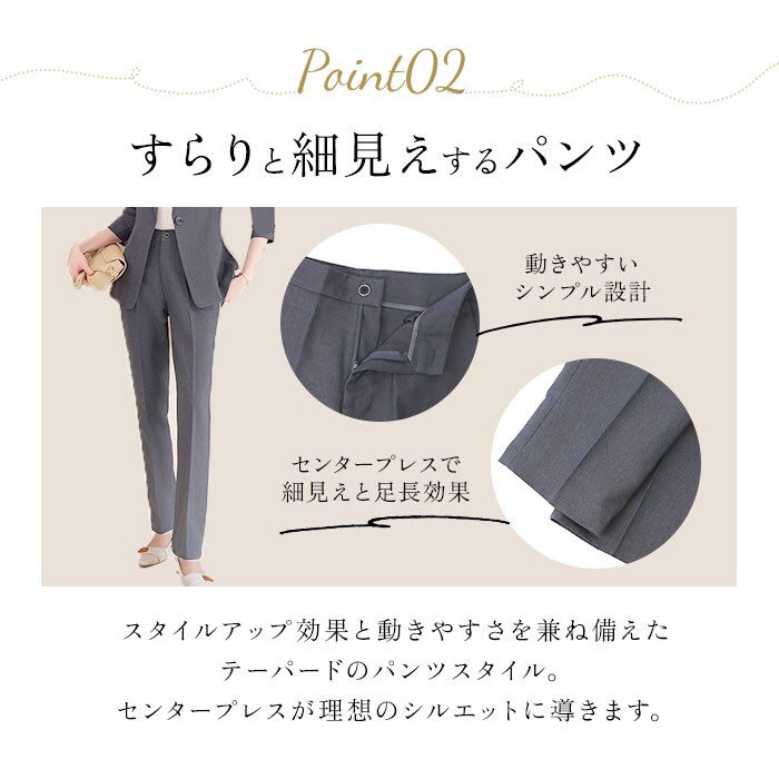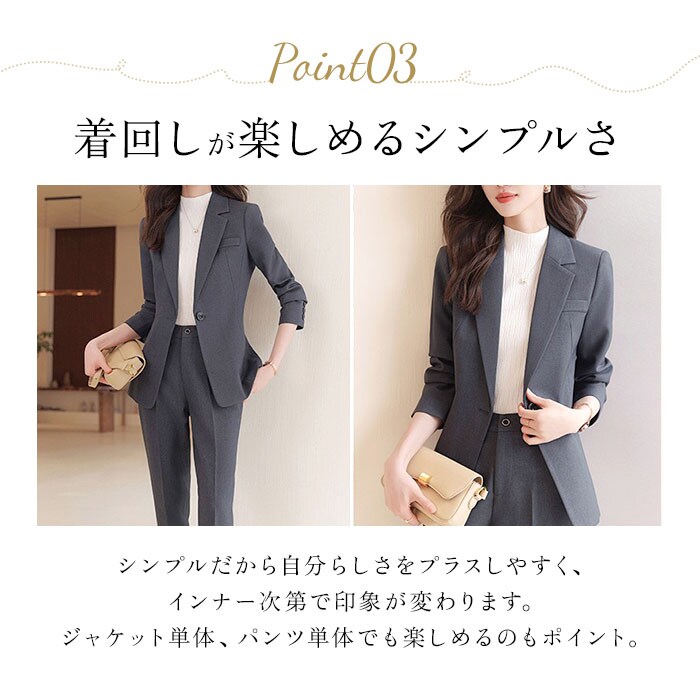 | 商品説明 | ビジネスからフォーマル、リクルートにも使える!シンプルなレディーススーツが発売♪【コスパ抜群シンプルスタイル】シンプルだからこそ、様々なシーンで着こなせる!ビジネス、フォーマル、リクルート、カジュアルスタイルにもフィット。【動きやすいパンツスタイル】ボトムスはパンツスタイルだから動きやすい!外回りが多いビジネスウーマンにもおススメ。【カジュアルスタイルにも】ジャケットに大きなボタンと両サイドポケットアリのデザインだから、かっちりしすぎずスニーカーなどとあわせてカジュアルにも着られるのが嬉しい♪【シルエットがキマル】パンツのセンタープレスと、大きすぎない肩パッド入でシルエットがキレイにキマる♪シワになりにくい生地も◎【オールシーズン仕様】ジャケット内部は袖部分まで裏地が入っているのでオールシーズン仕様なのもポイント。【お子さまの行事にも】華やかなフリルブラウスと組み合わせれば入園、入学式や卒園、卒業式のシーンにもぴったり。 |