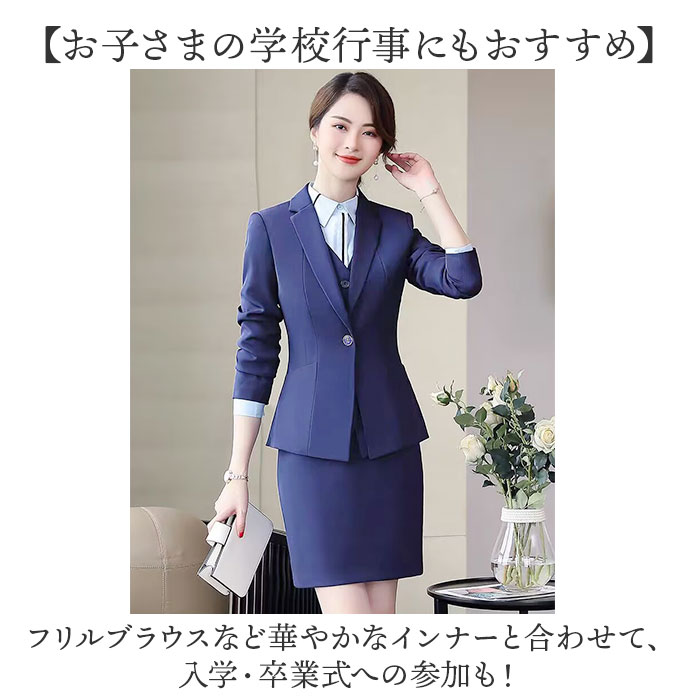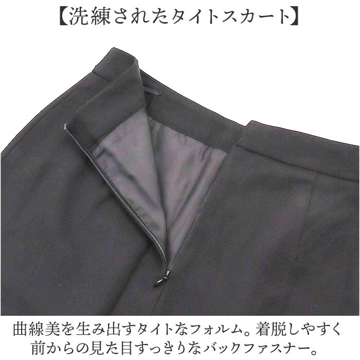 | 商品説明 | 【通勤やフォーマルシーンで活躍】使い勝手の良いベーシックデザイン。長く愛用できる、レディース用「ビジネススーツ」。【上品なキレイめスタイルが完成】シンプルできちんと感のあるジャケット&スカート。年代問わず着用しやすい仕上がり。【すっきりキマるシングルジャケット】肩パッドでシルエットをキープ&エレガントなラペルデザイン。スリムに魅せる絶妙な仕立て♪【ベーシックなシングルタイプ】フロントボタンを1つ配置し、スマートな印象を演出。左右にポケット付き。【洗練されたタイトスカート】曲線美を生み出すタイトなフォルム。着脱しやすく前からの見た目すっきりなバックファスナー。【オールシーズン使える万能アイテム】薄すぎず厚すぎない程よい生地感。裏地もプラスし着用時のムレを軽減、摩擦からも保護。【インナー次第でおしゃれ上級者♪】柄付きやデザイン性のあるブラウスなどで遊べば、グンと垢抜け!シーンに合わせて楽しめる☆【お子さまの学校行事にもおすすめ】フリルブラウスなど華やかなインナーと合わせて、入学・卒業式への参加も! |