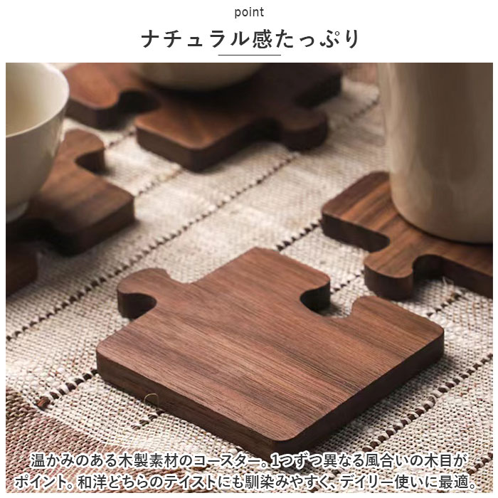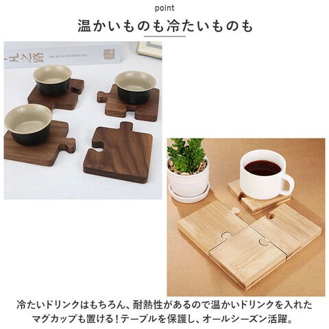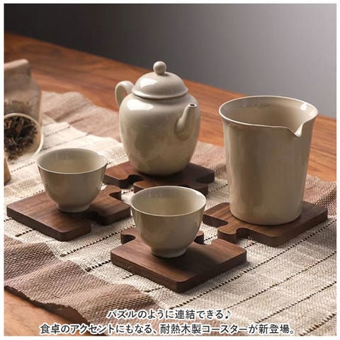 | 商品説明 | パズルのように連結できる♪食卓のアクセントにもなる、耐熱木製コースターが新登場。【ナチュラル感たっぷり】温かみのある木製素材のコースター。1つずつ異なる風合いの木目がポイント。和洋どちらのテイストにも馴染みやすく、デイリー使いに最適。【温かいものも冷たいものも】冷たいドリンクはもちろん、耐熱性があるので温かいドリンクを入れたマグカップも置ける!テーブルを保護し、オールシーズン活躍。【おもてなしにもぴったり】置いておくだけで楽しい気分になれるデザイン。1人や家族と過ごす時間にはもちろん、友人を招いたティータイムにも♪【お気に入りをチョイス】滑らかなタケ、明るさのあるケヤキと深みのあるウォールナット。お好みで選ぶも良し、色違いで揃えるのもおすすめ。 |