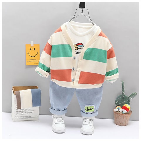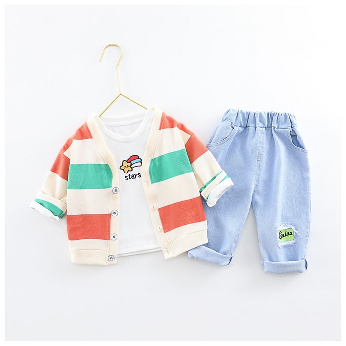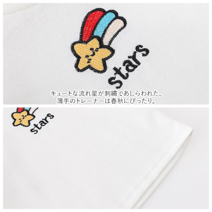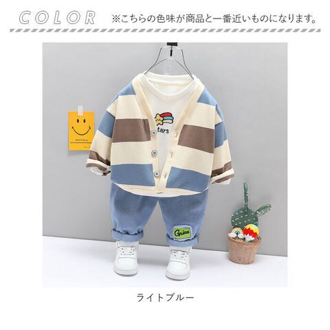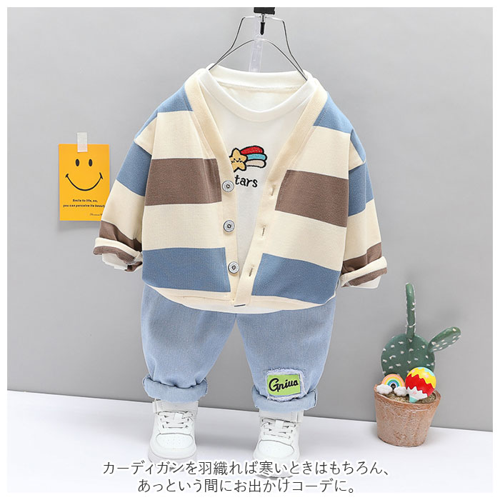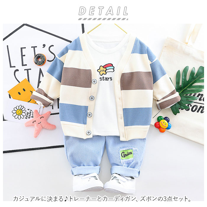 | 商品説明 | カジュアルに決まる♪トレーナーとカーディガン、ズボンの3点セット。キュートな流れ星が刺?であしらわれた、薄手のトレーナーは春秋にぴったり。カーディガンを羽織れば寒いときはもちろん、あっという間にお出かけコーデに。ズボンには左右のダミーポケットと、左膝のダメージジーンズ風のステッチが遊び心もあり。バックには子供もあると何かと便利♪なポケット×1付き。ユニセックスなデザインなので、兄妹で色違いでお揃いコーデもの楽しめる♪ |
