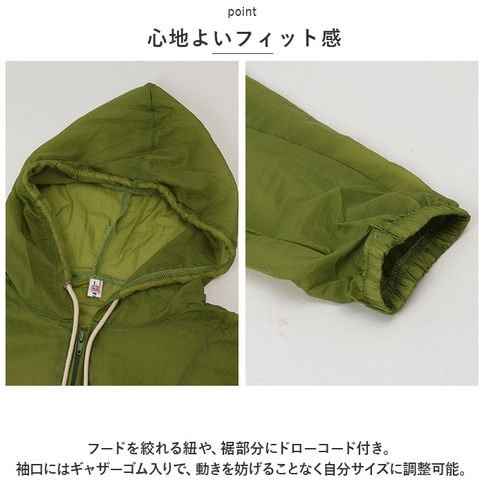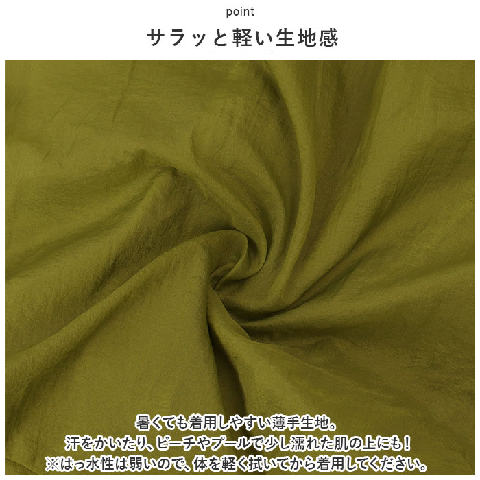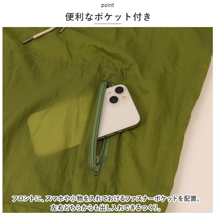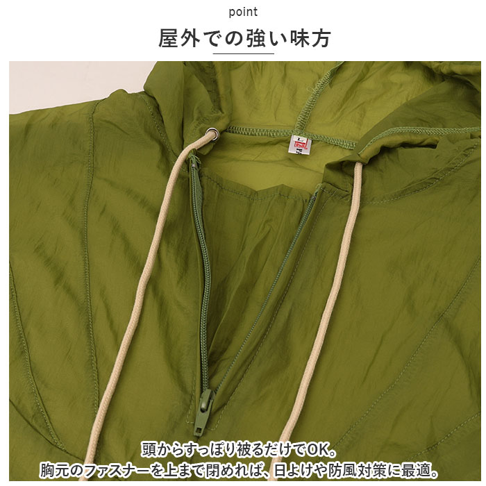 | 商品説明 | レジャーシーンでの日よけや防風対策に。サッと着られる薄手のフード付きパーカーが新登場。【サラッと軽い生地感】暑くても着用しやすい薄手生地。汗をかいたり、ビーチやプールで少し濡れた肌の上にも!(※はっ水性は弱いので、体を軽く拭いてから着用してください。)【屋外での強い味方】頭からすっぽり被るだけでOK。胸元のファスナーを上まで閉めれば、日よけや防風対策に最適。【心地よいフィット感】フードを絞れる紐や、裾部分にドローコード付き。袖口にはギャザーゴム入りで、動きを妨げることなく自分サイズに調整可能。【便利なポケット付き】フロントに、スマホや小物を入れておけるファスナーポケットを配置。左右どちらからも出し入れできるつくり。【持ち運びラクラク】軽量で折りたたんでスリムに持ち運び♪バッグに忍ばせておけば安心。 |