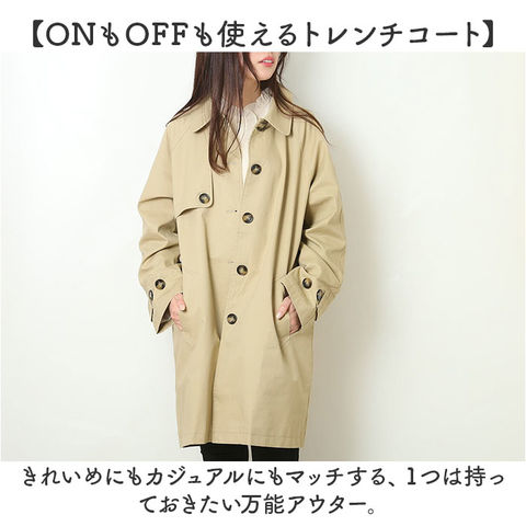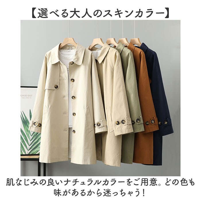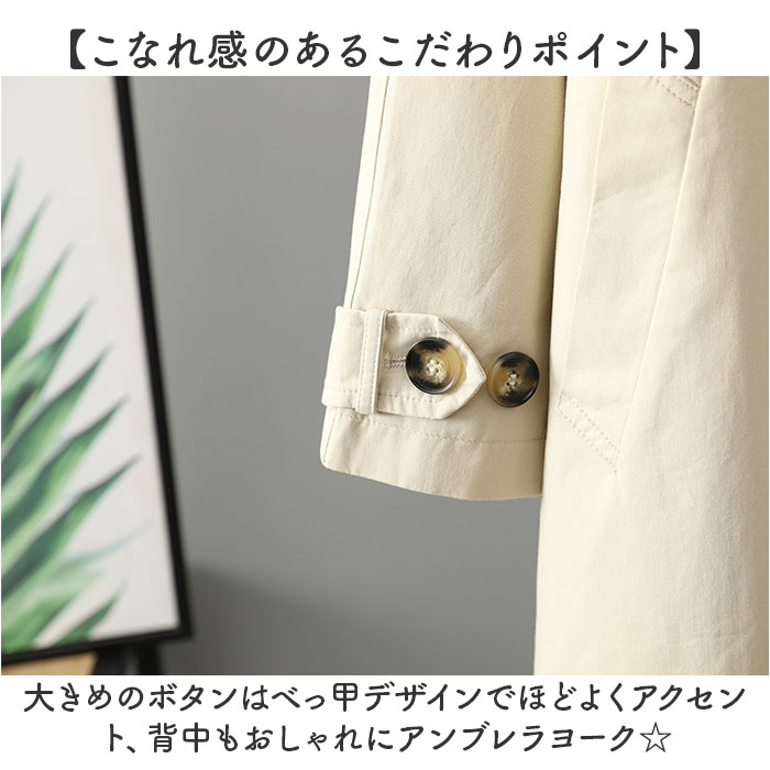 | 商品説明 | 【定番スタイルが嬉しい☆】お休みも通学も通勤もお洒落着も、全部これでOK!「トレンチコート」が登場。【ONもOFFも使えるトレンチコート】きれいめにもカジュアルにもマッチする、1つは持っておきたい万能アウター。【季節の変わり目に大活躍する】裏地付の生地は、寒暖差が激しい季節の変わり目にぴったり!春、秋に大活躍!【スッキリミドル丈で軽やかに♪】絶妙なミドル丈は上品で、羽織るだけで洗練された印象に。ロングより軽やかなのも魅力。【飽きがこない、定番スタイル☆】シンプルさとベーシックさを大切にした、流行り廃りのないデザインでずっと愛用できる♪【こなれ感のあるこだわりポイント】大きめのボタンはべっ甲デザインでほどよくアクセント、背中もおしゃれにアンブレラヨーク☆【ちょっと硬めの高見え生地】コットンを使用した上質な生地は、ちょっとハリがあり上質な雰囲気。大人にちょうどいい作り【便利なポケットを配置】両サイドにポケットを配置。スマホなどをサッと出し入れでき、快適さがUP!【選べる大人のスキンカラー】肌なじみの良いナチュラルカラーをご用意。どの色も味があるから迷っちゃう! |