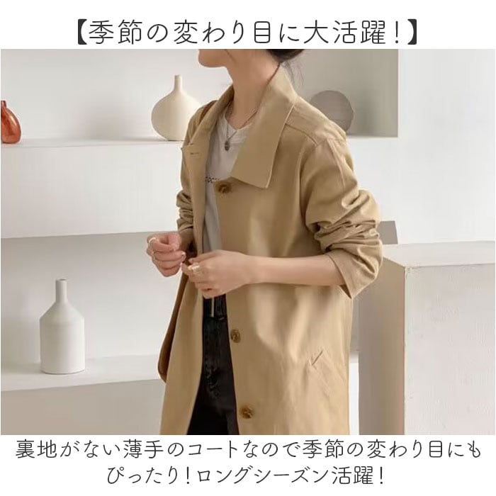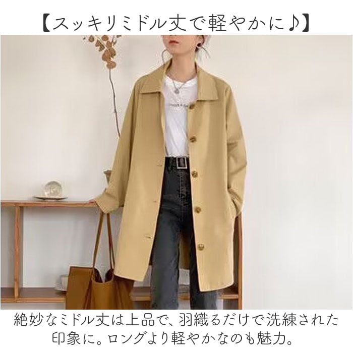 | 商品説明 | 【定番スタイルが嬉しい☆】お休みも通学も通勤もお洒落着も、全部これでOK!「トレンチコート」が登場。【季節の変わり目に大活躍!】裏地がない薄手のコートなので季節の変わり目にもぴったり!ロングシーズン活躍!【スッキリミドル丈で軽やかに♪】絶妙なミドル丈は上品で、羽織るだけで洗練された印象に。ロングより軽やかなのも魅力。【飽きがこない、定番スタイル☆】シンプルさとベーシックさを大切にした、流行り廃りのないデザインでずっと愛用できる♪【こなれ感のあるこだわりポイント】大きめのボタンはべっ甲デザインでほどよいアクセント。Iラインシルエットでスッキリ見え。【便利なポケットを配置】両サイドにポケットを配置。スマホなどをサッと出し入れでき、快適さがUP!【様々なコーデに対応】落ち着きのある無地のワンカラー。カジュアルにもキレイめファッションにも着まわせる優秀アイテム! |