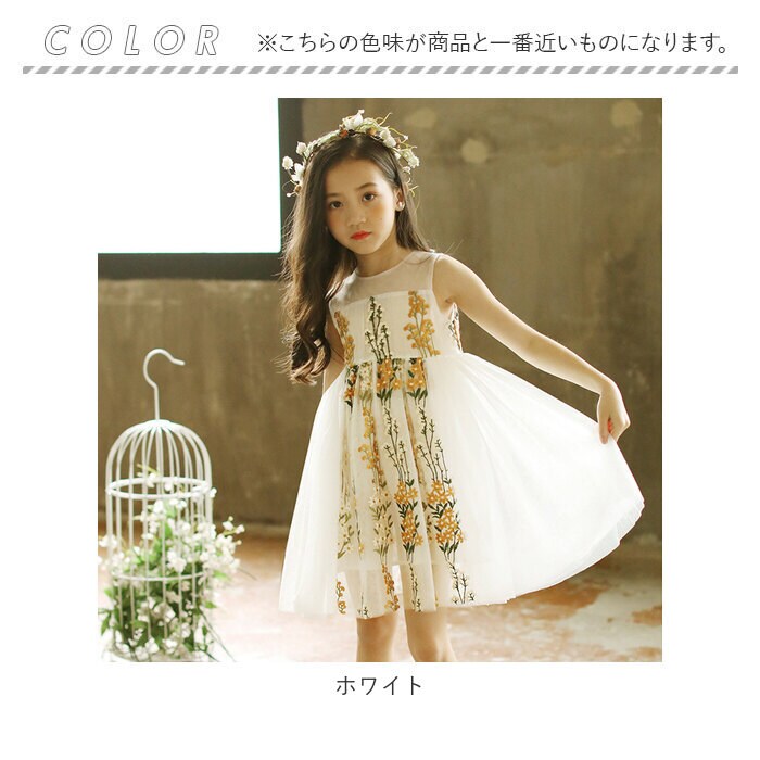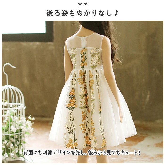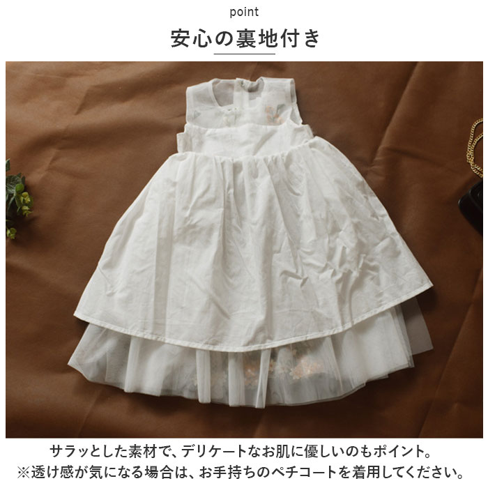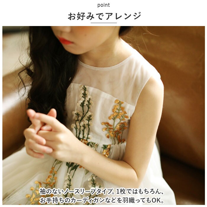 | 商品説明 | おしゃれにドレスアップ!可愛いお姫様に変身できるドレスが新登場。【ナチュラルな刺繍ドレス】目立ちすぎず、自然な可愛さが引き立つ♪ボタニカルフラワーの刺繍デザインが印象的。【ふんわりAラインシルエット】スカート部分にはチュールを2枚重ね、程よくボリュームをプラス。エアリー感のある優しい雰囲気に♪【着脱カンタン】背中ファスナーをサッと上げるだけ◎【安心の裏地付き】サラッとした素材で、デリケートなお肌に優しいのもポイント。(※透け感が気になる場合は、お手持ちのペチコートを着用してください。)【後ろ姿もぬかりなし♪】背面にも刺繍デザインを施し、後ろから見てもキュート!【お好みでアレンジ】袖のないノースリーブタイプ。1枚ではもちろん、お手持ちのカーディガンなどを羽織ってもOK。【特別な日にぴったり】お誕生日会、発表会などのイベントやフォーマルシーンで活躍★ |