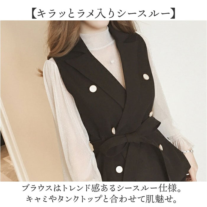 | 商品説明 | 【華やかなシーンに】華やかに着こなしができる!カラーパンツスーツが新発売♪【嬉しいセットアップ】・1アイテムでコーデが完了。コーデに悩まないベスト・ベスト・ブラウスのセットアップ。【キラッとラメ入りシースルー】ブラウスはトレンド感あるシースルー仕様。キャミやタンクトップと合わせて肌魅せ。【オールシーズン着まわせる】そのまま着るのはもちろん、ジャケットやコートと合わせても大人カワイイベスト。【いつもの洋服のように着られる】ベストやパンツは伸縮性があり、軽い着心地でいつもの洋服のように着こなせる。【催事やお呼ばれにピッタリ】ラメ入りのブラウスや、パール調のボタンなど細かいところまで華やかさアリ☆【嬉しいウエストゴム】パンツ背面にゴムギャザーを取り入れ、キレイなシルエットを保ちながら穿き心地GOOD。【ポケットつき】ハンカチなどちょっとした小物を入れるのに便利なポケットをパンツサイドに配置。【普段のお出かけにも】きっちり過ぎないデザインで、タウンユースでカジュアルに使うのもおススメ♪ |