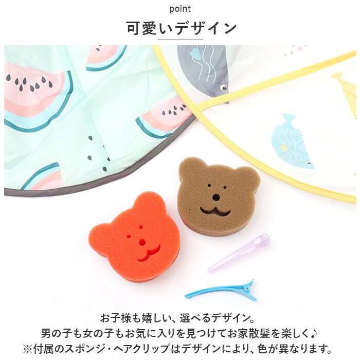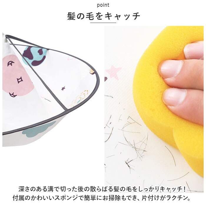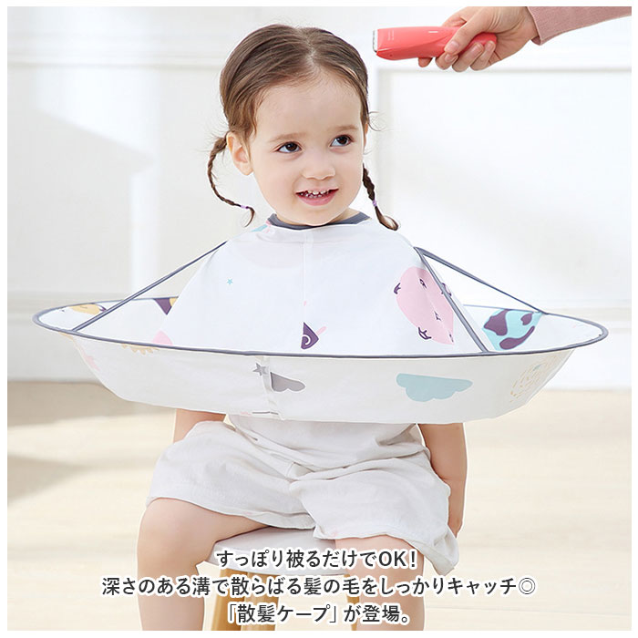 | 商品説明 | すっぽり被るだけでOK!深さのある溝で散らばる髪の毛をしっかりキャッチ◎「散髪ケープ」が登場。【被るだけでOK】すっぽり被るだけでOKの簡単着用。宇宙船のようなケープ姿が可愛く、片付けが大変なお家での散髪タイムをスムーズにしてくれるアイテム。【面ファスナーで調節◎】首回りには広めの面ファスナーがついているので、サイズ調節が可能。首にピタっとフィットするので、髪の毛を侵入させない◎【髪の毛をキャッチ】深さのある溝で切った後の散らばる髪の毛をしっかりキャッチ!付属のかわいいスポンジで簡単にお掃除もでき、片付けがラクチン。【コンパクトに収納】くるっとねじって丸まれば、コンパクトに収納可能!使わない時は場所をとらずに収納できるのも嬉しいポイント。【撥水加工】撥水加工を施した生地なので、水で流して丸洗いOK!お手入れが簡単なので繰り返し使える◎【可愛いデザイン】お子様も嬉しい、選べるデザイン。男の子も女の子もお気に入りを見つけてお家散髪を楽しく♪※付属のスポンジ・ヘアクリップはデザインにより、色が異なります。 |