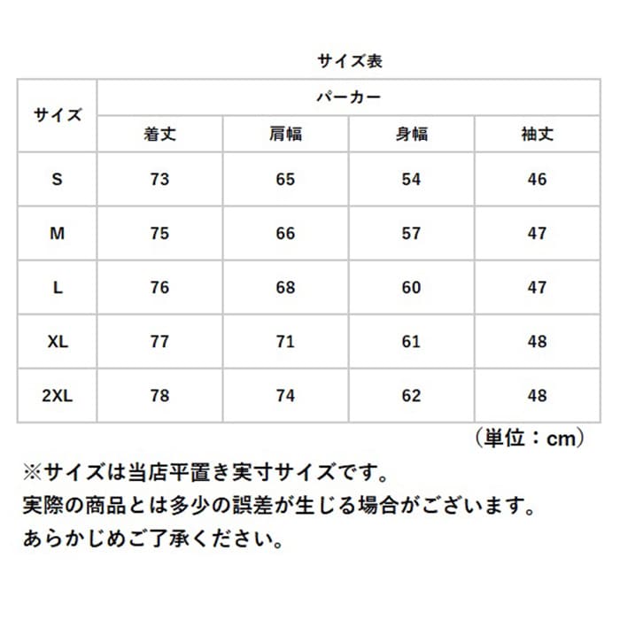 | 注意点 | 海外輸入品のため、商品によってはパッケージや説明書が、英語や中国語表記となっている場合があります。商品を安価でご提供させていただくため、輸入時のパッケージのままでのお届けとなります。予めご了承くださいませ。商品の写真はできる限り実物のお色に近づけるように加工しておりますが、お使いのモニター設定、お部屋の照明などにより、実際の商品と異なる場合がございます。商品の生産時期などにより、付属品(ボタン、ファスナー、タグ、パッケージなど)のデザインや仕様の一部が変更になる場合がございますが、予めご了承くださいませ。商品や個体差などにより、表記と若干異なる場合がございますが、予めご了承くださいませ。輸入品のため、糸の継ぎ目や縫製等が甘い部分、糊跡等が生じる場合がございますが、予めご了承くださいませ。生地の特性上、やや匂いが強く感じられるものもございます。数日のご使用や陰干しなどで気になる匂いはほとんど感じられなくなります。お手入れなどはタグなどの表記をご確認ください。配送の方法によっては、商品に多少のシワ等ができる場合がございますが、出来る限りお客様にリーズナブルな価格帯でご提供するためです。ご了承くださいませ。採寸方法の違いにより、多少の誤差がある場合がございます。 |