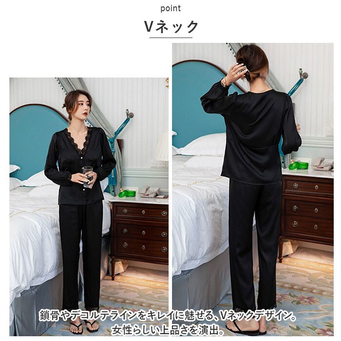 | 商品説明 | サラっと快適な着心地で毎日着たくなる♪「パジャマ セットアップ」が登場。【大人カワイイ】まるでシルクのようなサラっとした生地。程よい光沢感とレースが大人カワイイデザイン♪【Vネック】鎖骨やデコルテラインをキレイに魅せる、Vネックデザイン。女性らしい上品さを演出。【ロングシーズン】程よい薄手の生地感!夏の冷房冷え対策で着るのもおススメ。【締め付け感なし】締め付け感のないラクな着心地。お家でのリラックスタイムにもピッタリ☆ラクさと可愛さを両立!【選べるカラー】女性らしい落ち着きのあるカラーのラインアップ。お気に入りがきっと見つかる♪ |