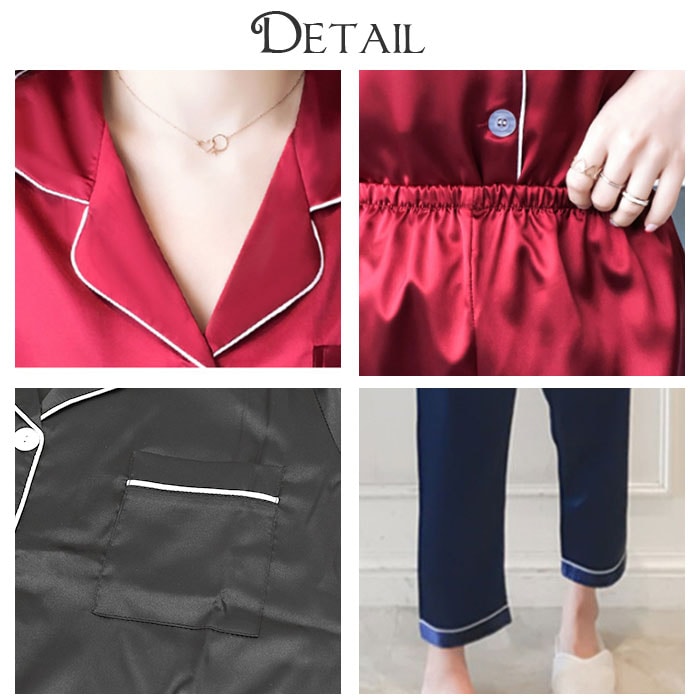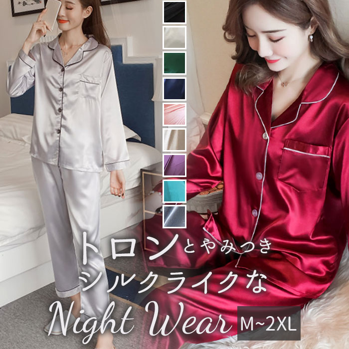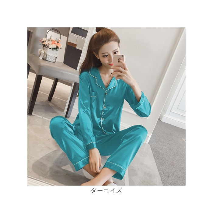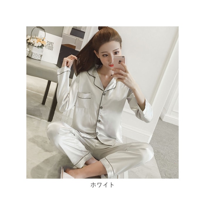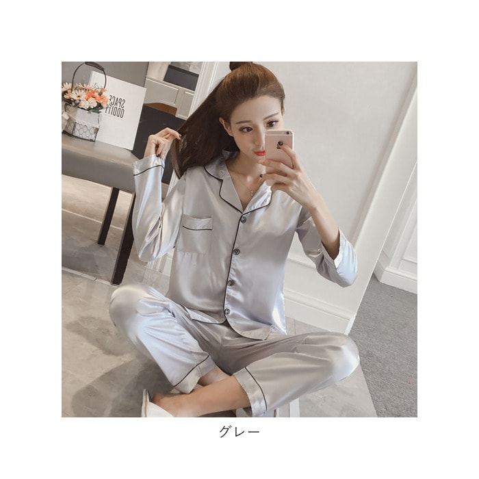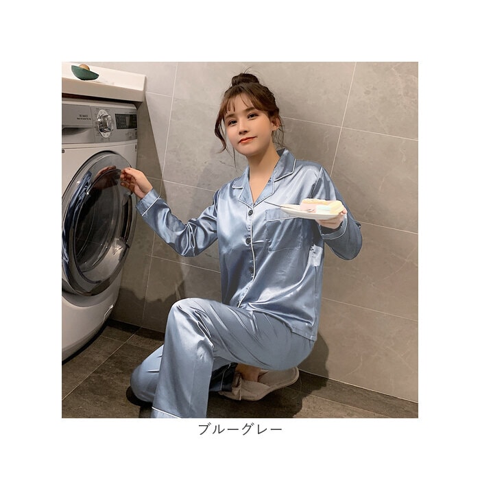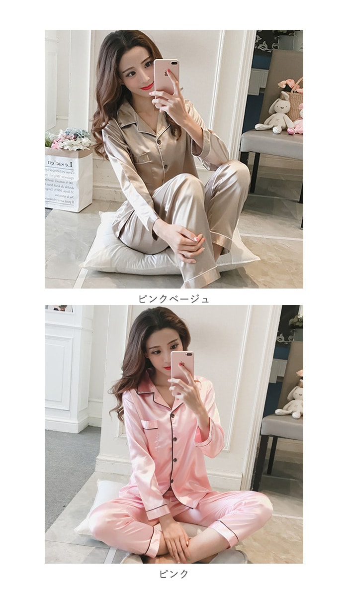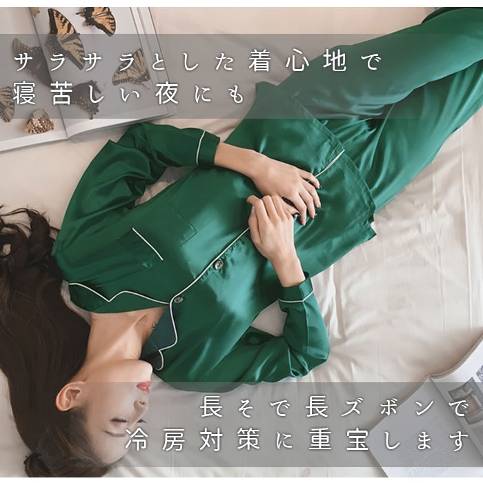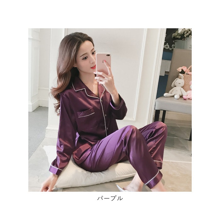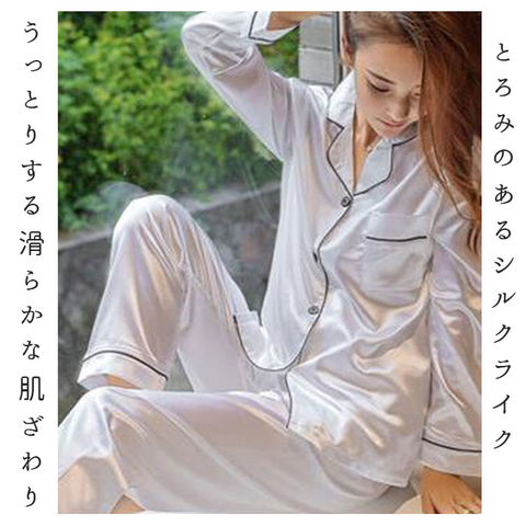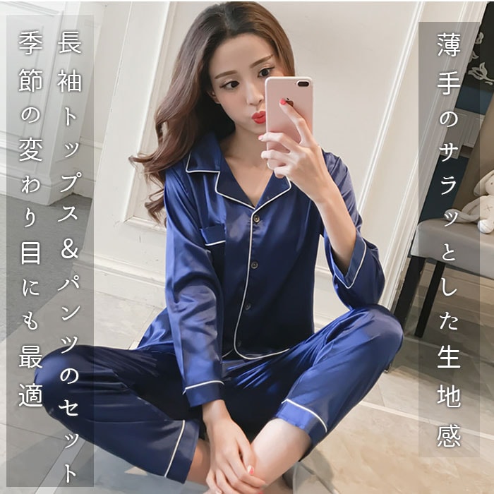 | 商品説明 | お家の中でも可愛くいたい♪そんな女性にぴったりなパジャマが新登場。【季節の変わり目にも最適】長袖トップス&パンツのセット。薄手のサラッとした生地感で、お手持ちのカーディガンをサッと羽織ってもOK。【ストレスフリーな着心地】光沢のあるサテンのような素材を使用。滑らかな肌触りで、睡眠中も快適。【ベーシックな長袖トップス】スムーズに脱ぎ着できるフロントボタンタイプ。襟元が程よく開いて寝苦しさを軽減◎左胸元にポケット付き。【ロング丈のパンツ】締めつけ感のないウエストゴム仕様。足元を冷やしたくない方におすすめ。【持ち運びにも便利】折りたたんでもかさばりにくく、旅行やお泊まり会にも♪ |